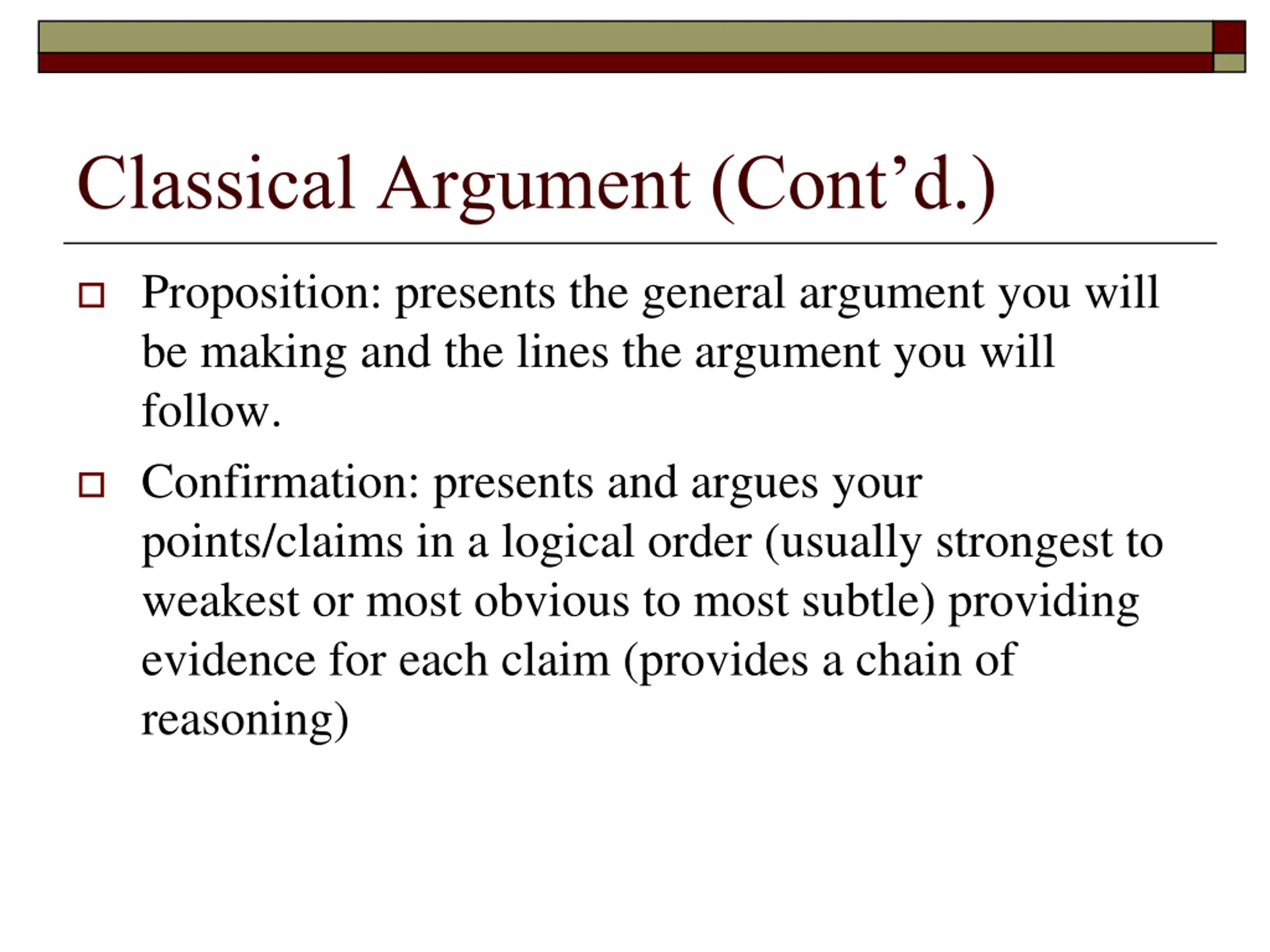 Classical Argument (Contd.) Proposition: presents the general argument you will be making and the lines the argument you will follow. Confirmation: presents and argues your points/claims in a logical order (usually strongest to weakest or most obvious to most subtle) providing evidence for each claim (provides a chain of reasoning)