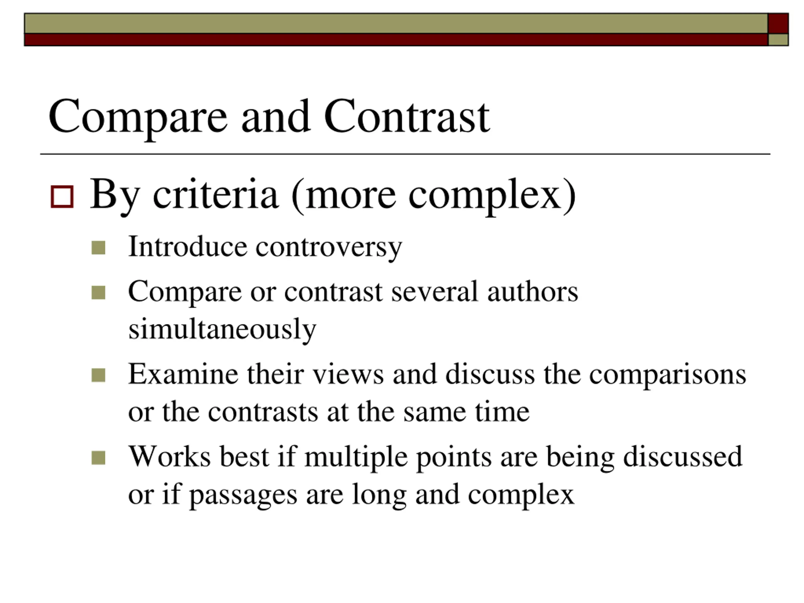 Compare and Contrast By criteria (more complex) Introduce controversy Compare or contrast several authors simultaneously Examine their views and discuss the comparisons or the contrasts at the same time Works best if multiple points are being discussed or if passages are long and complex