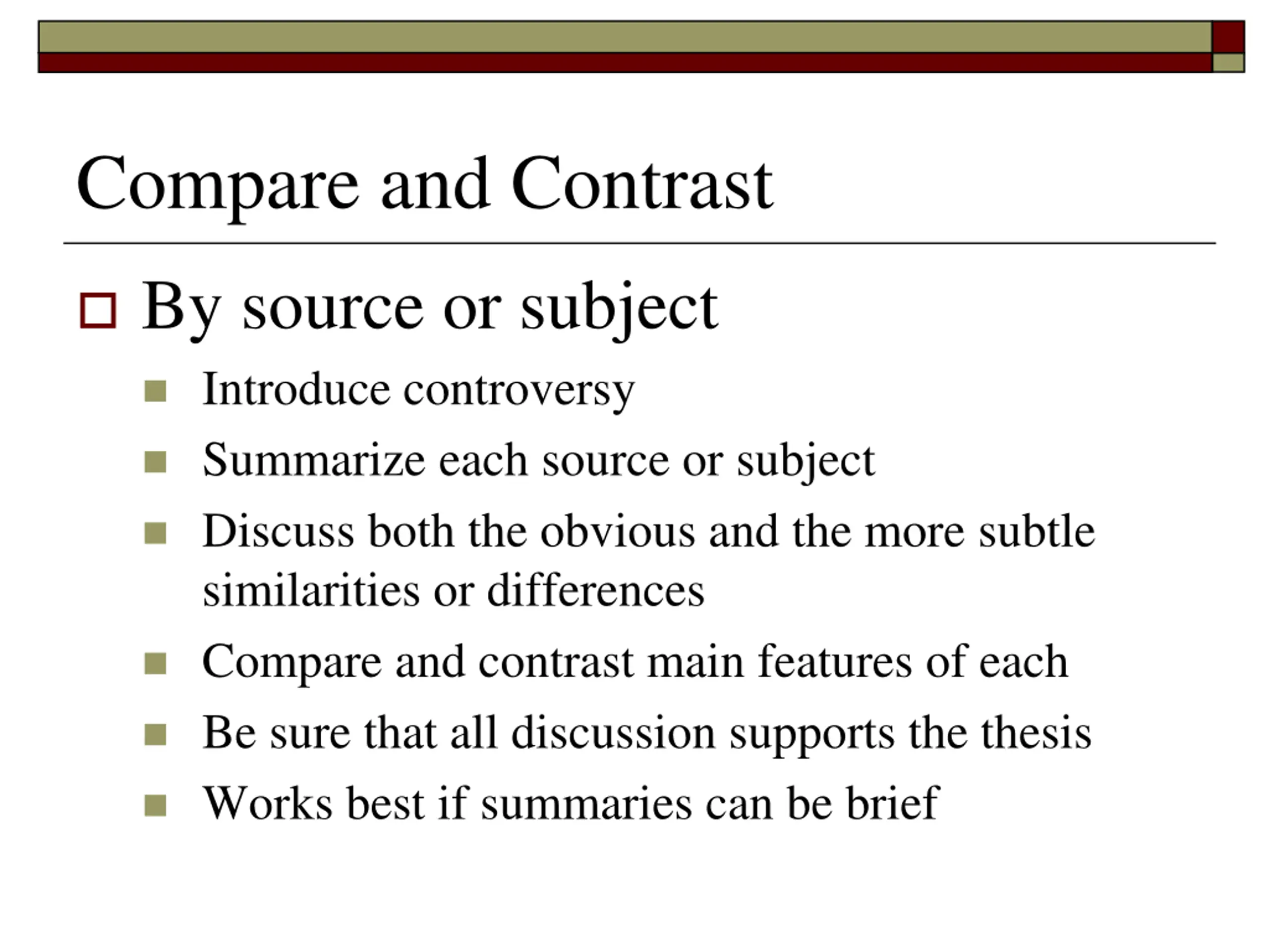 Compare and Contrast By source or subject Introduce controversy Summarize each source or subject Discuss both the obvious and the more subtle similarities or differences Compare and contrast main features of each Be sure that all discussion supports the thesis Works best if summaries can be brief