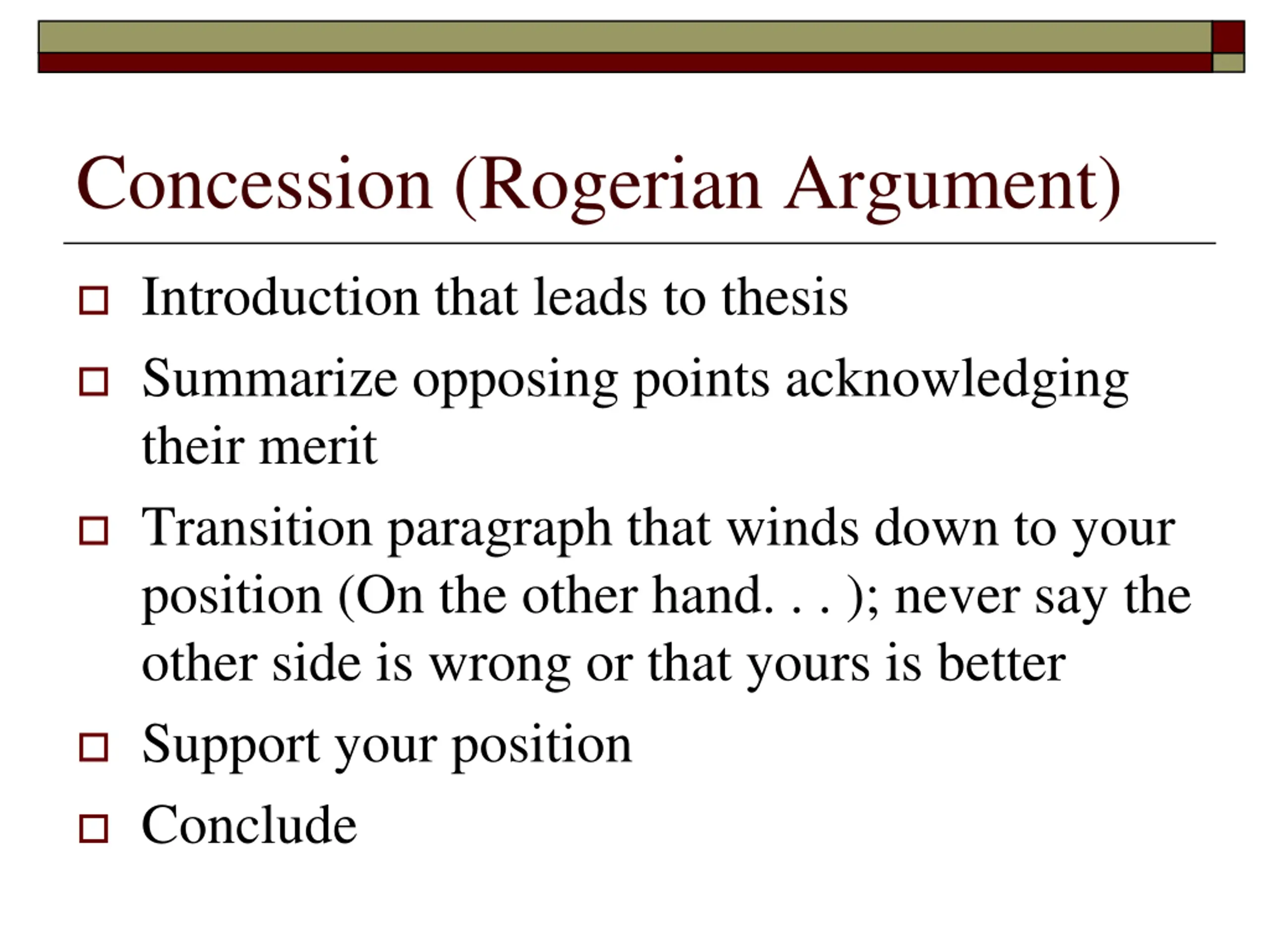 Concession (Rogerian Argument) Introduction that leads to thesis Summarize opposing points acknowledging their merit Transition paragraph that winds down to your position (On the other hand. . . ); never say the other side is wrong or that yours is better Support your position Conclude