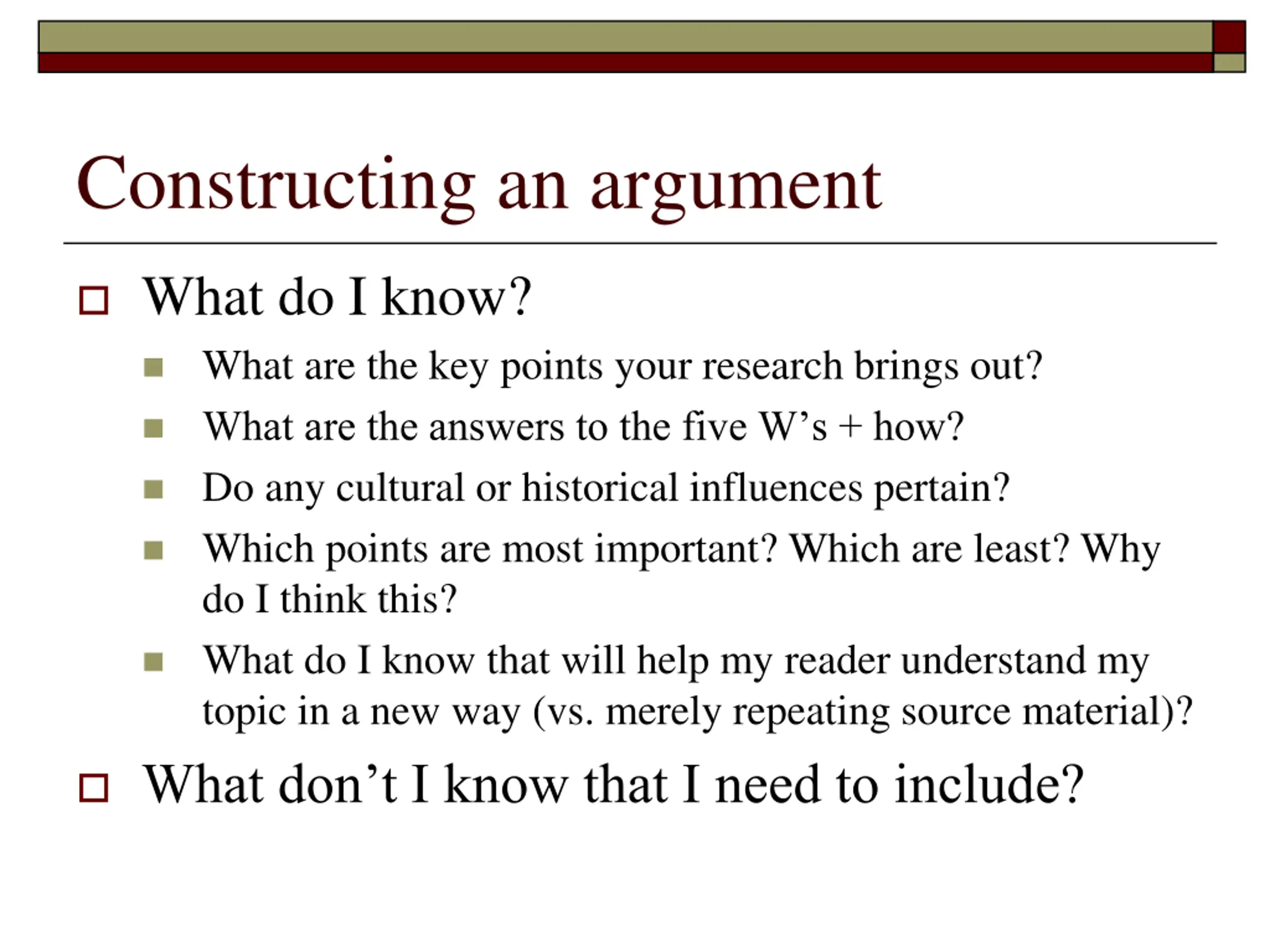 Constructing an argument What do I know? What are the key points your research brings out? What are the answers to the five W s + how? Do any cultural or historical influences pertain? Which points are most important? Which are least? Why do I think this? What do I know that will help my reader understand my topic in a new way (vs. merely repeating source material)? What don t I know that I need to include?