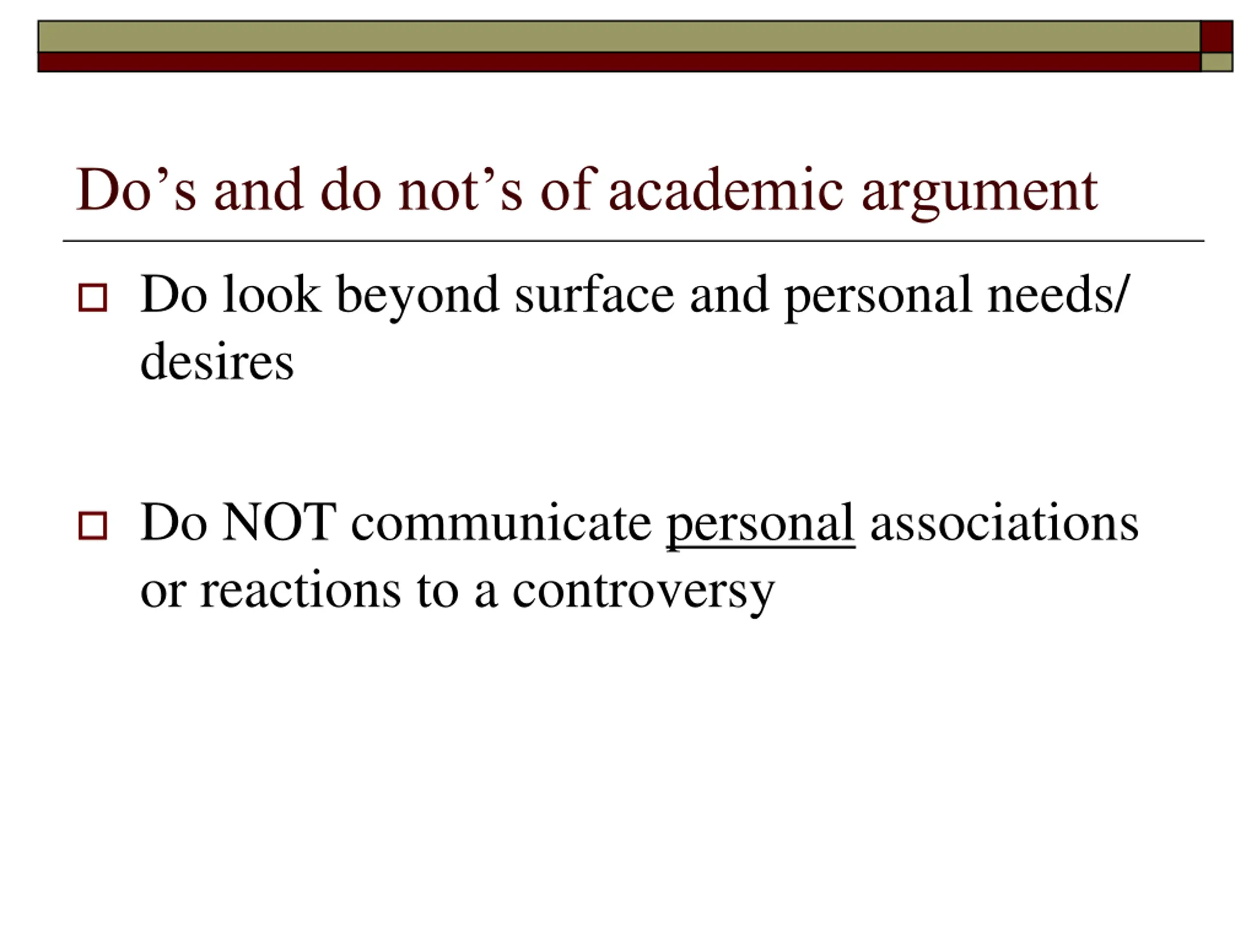 Dos and do nots of academic argument Do look beyond surface and personal needs/ desires Do NOT communicate personal associations or reactions to a controversy