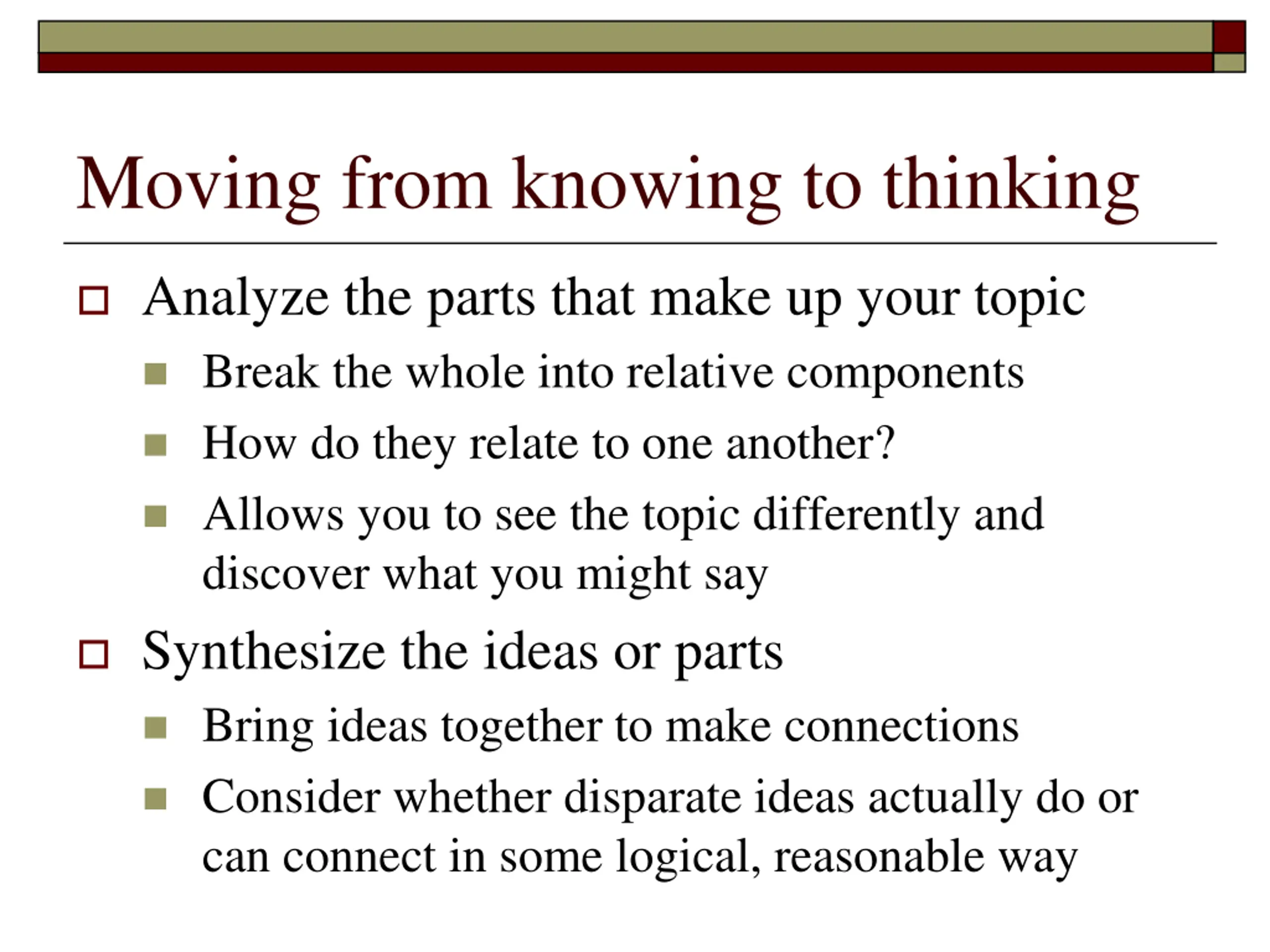 Moving from knowing to thinking Analyze the parts that make up your topic Break the whole into relative components How do they relate to one another? Allows you to see the topic differently and discover what you might say Synthesize the ideas or parts Bring ideas together to make connections Consider whether disparate ideas actually do or can connect in some logical, reasonable way