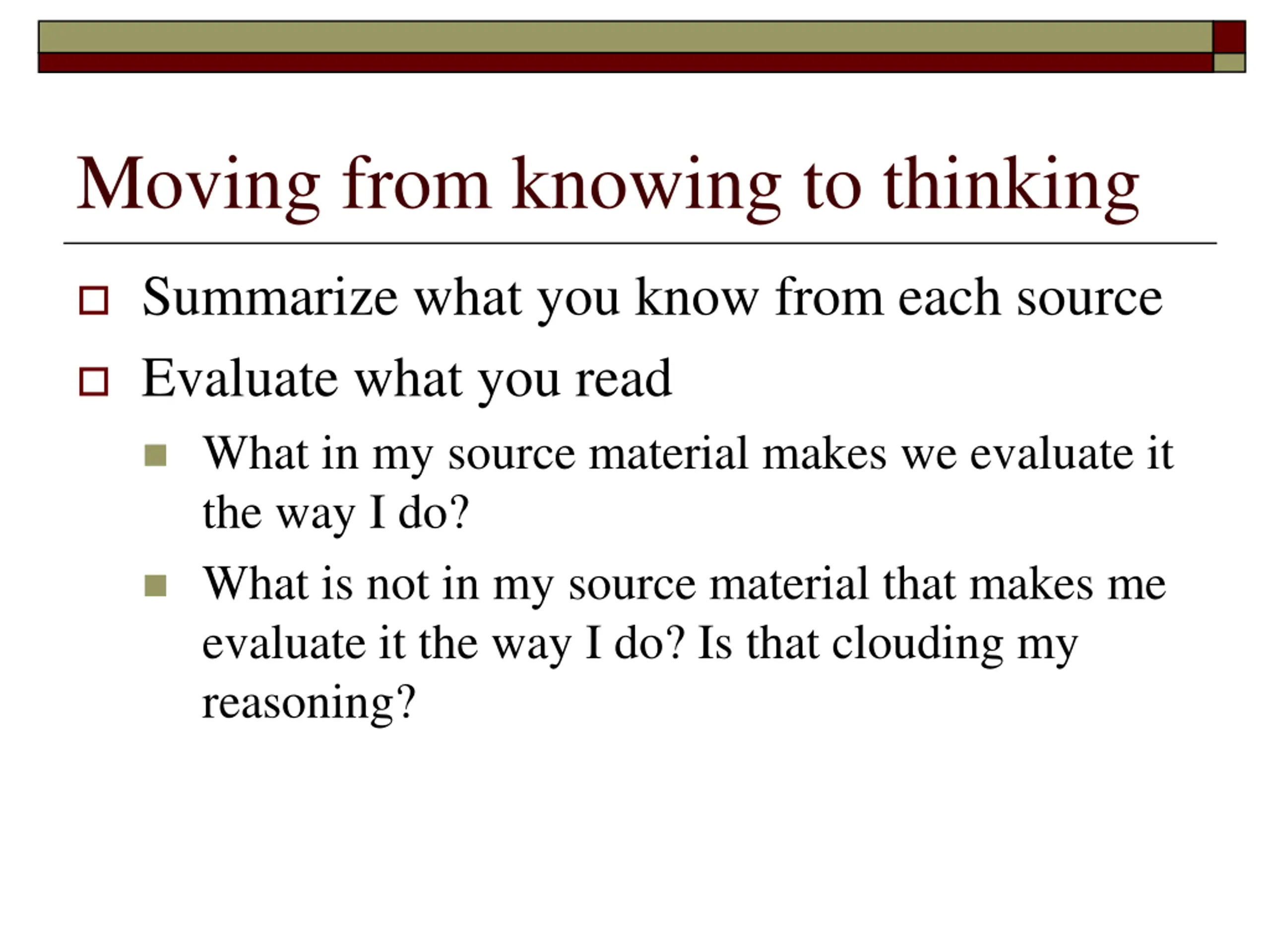 Moving from knowing to thinking Summarize what you know from each source Evaluate what you read What in my source material makes we evaluate it the way I do? What is not in my source material that makes me evaluate it the way I do? Is that clouding my reasoning?