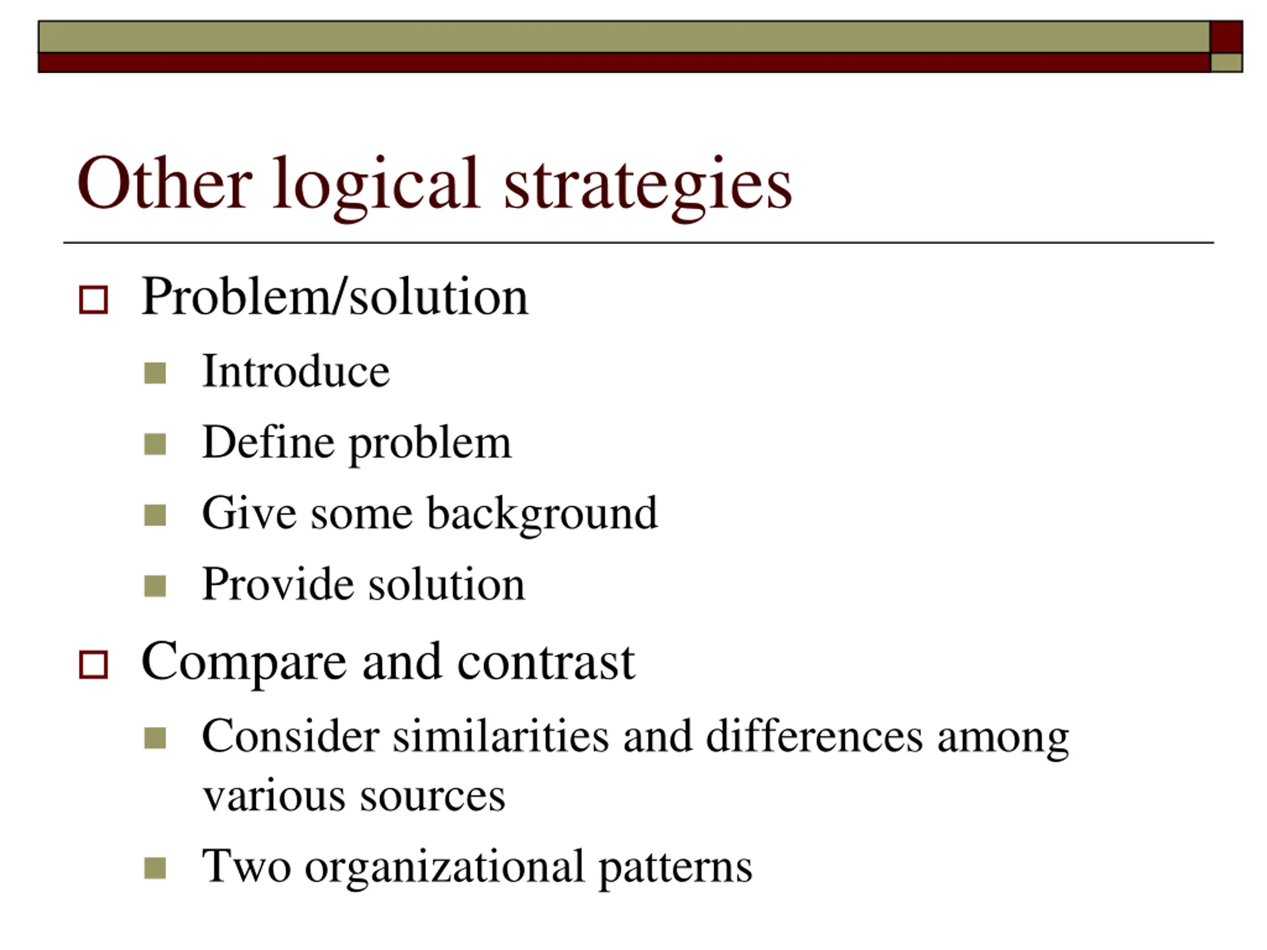 Other logical strategies Problem/solution Introduce Define problem Give some background Provide solution Compare and contrast Consider similarities and differences among various sources Two organizational patterns