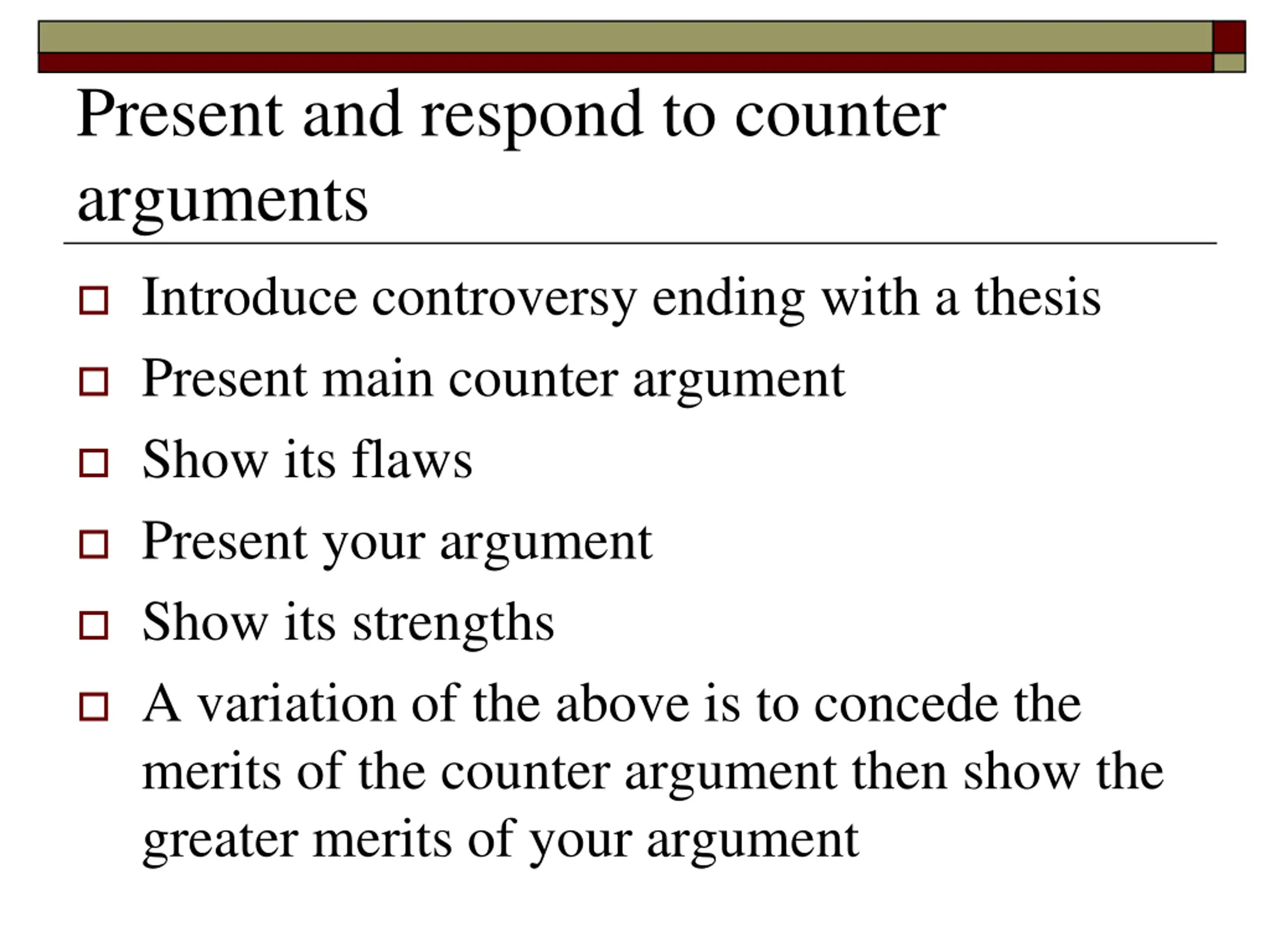 Present and respond to counter arguments Introduce controversy ending with a thesis Present main counter argument Show its flaws Present your argument Show its strengths A variation of the above is to concede the merits of the counter argument then show the greater merits of your argument