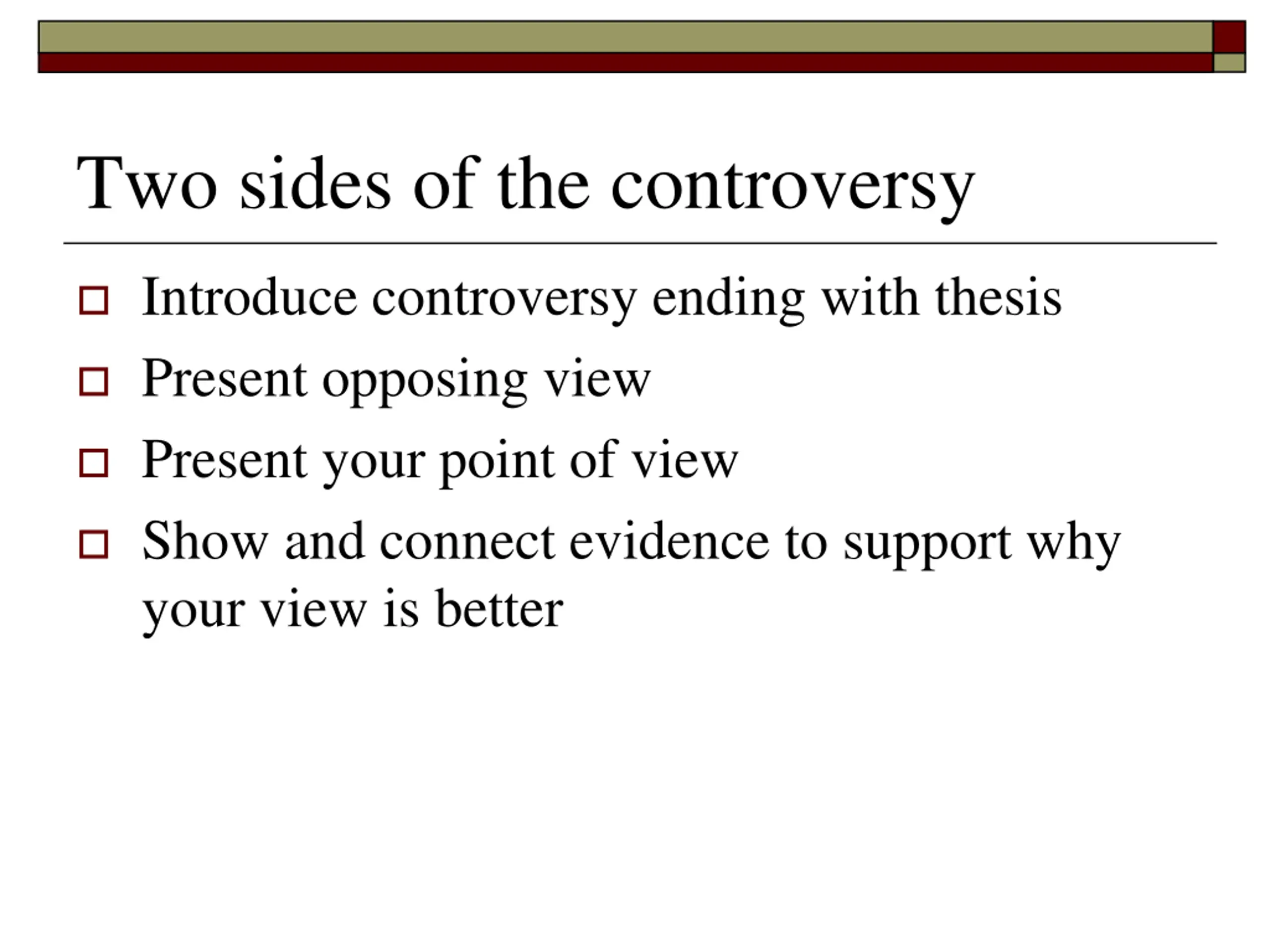 Two sides of the controversy Introduce controversy ending with thesis Present opposing view Present your point of view Show and connect evidence to support why your view is better