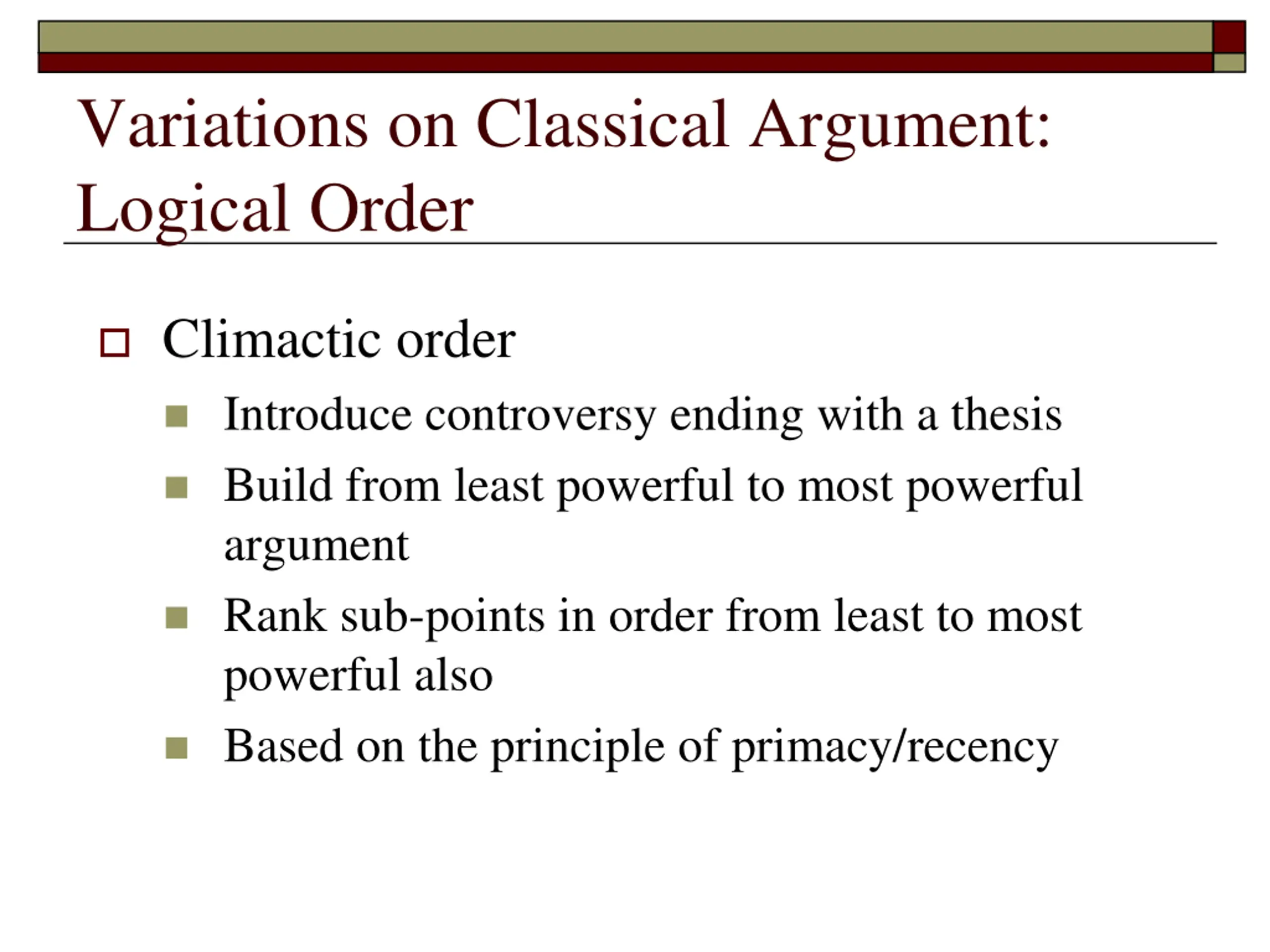 Variations on Classical Argument: Logical Order Climactic order Introduce controversy ending with a thesis Build from least powerful to most powerful argument Rank sub-points in order from least to most powerful also Based on the principle of primacy/recency
