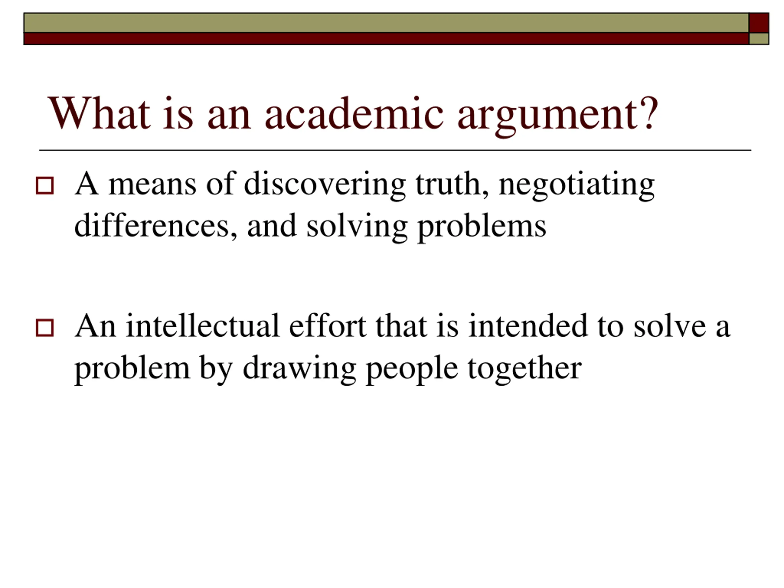 What is an academic argument? A means of discovering truth, negotiating differences, and solving problems An intellectual effort that is intended to solve a problem by drawing people together