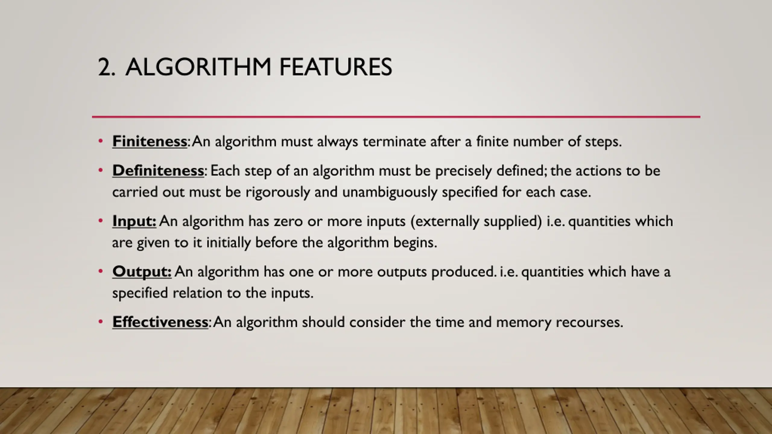 2. ALGORITHM FEATURES Finiteness: An algorithm must always terminate after a finite number of steps. Definiteness: Each step of an algorithm must be precisely defined; the actions to be carried out must be rigorously and unambiguously specified for each case. Input:An algorithm has zero or more inputs (externally supplied) i.e. quantities which are given to it initially before the algorithm begins. Output:An algorithm has one or more outputs produced. i.e. quantities which have a specified relation to the inputs. Effectiveness: An algorithm should consider the time and memory recourses.