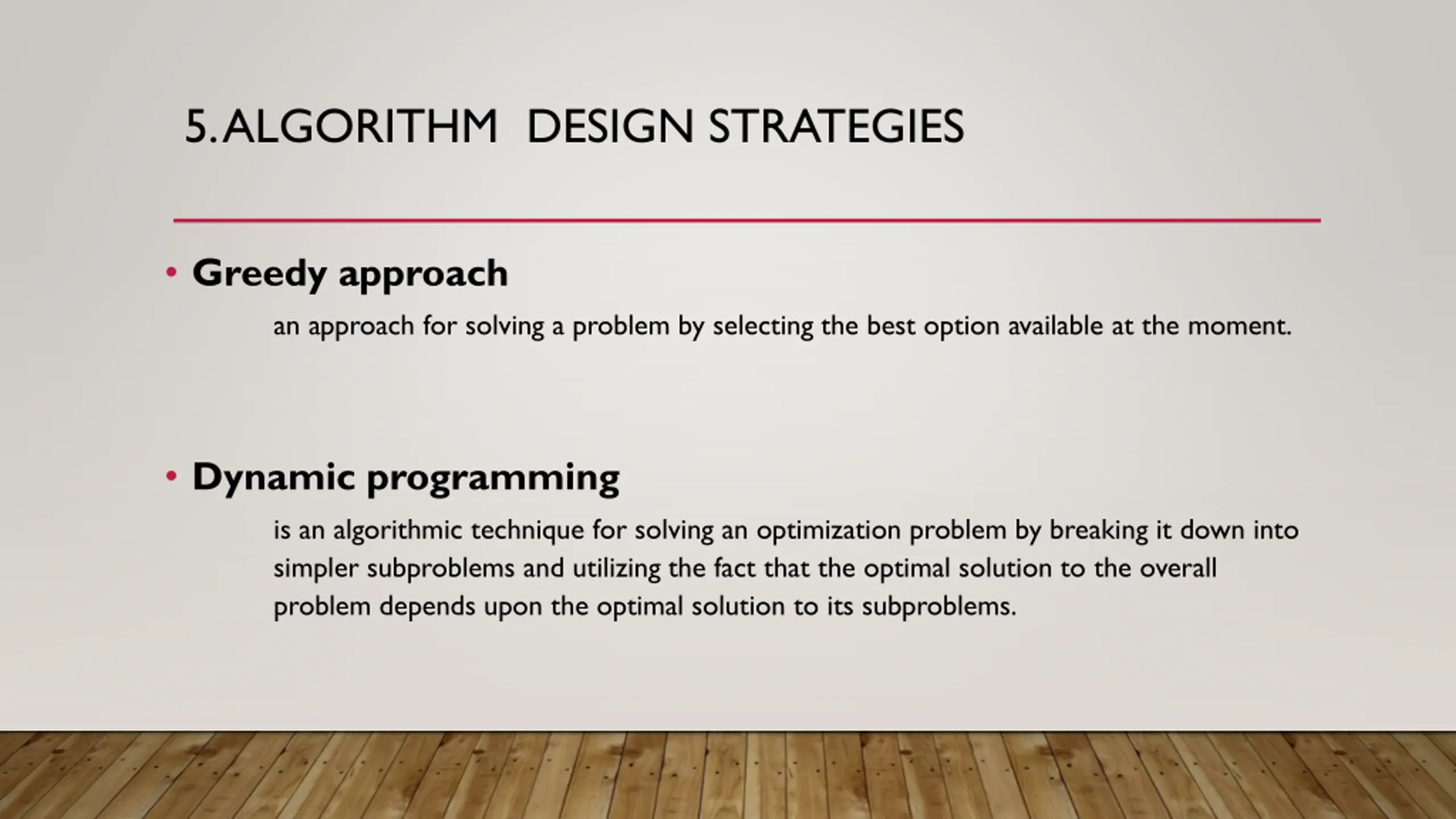 5. ALGORITHM DESIGN STRATEGIES Greedy approach an approach for solving a problem by selecting the best option available at the moment. Dynamic programming is an algorithmic technique for solving an optimization problem by breaking it down into simpler subproblems and utilizing the fact that the optimal solution to the overall problem depends upon the optimal solution to its subproblems.
