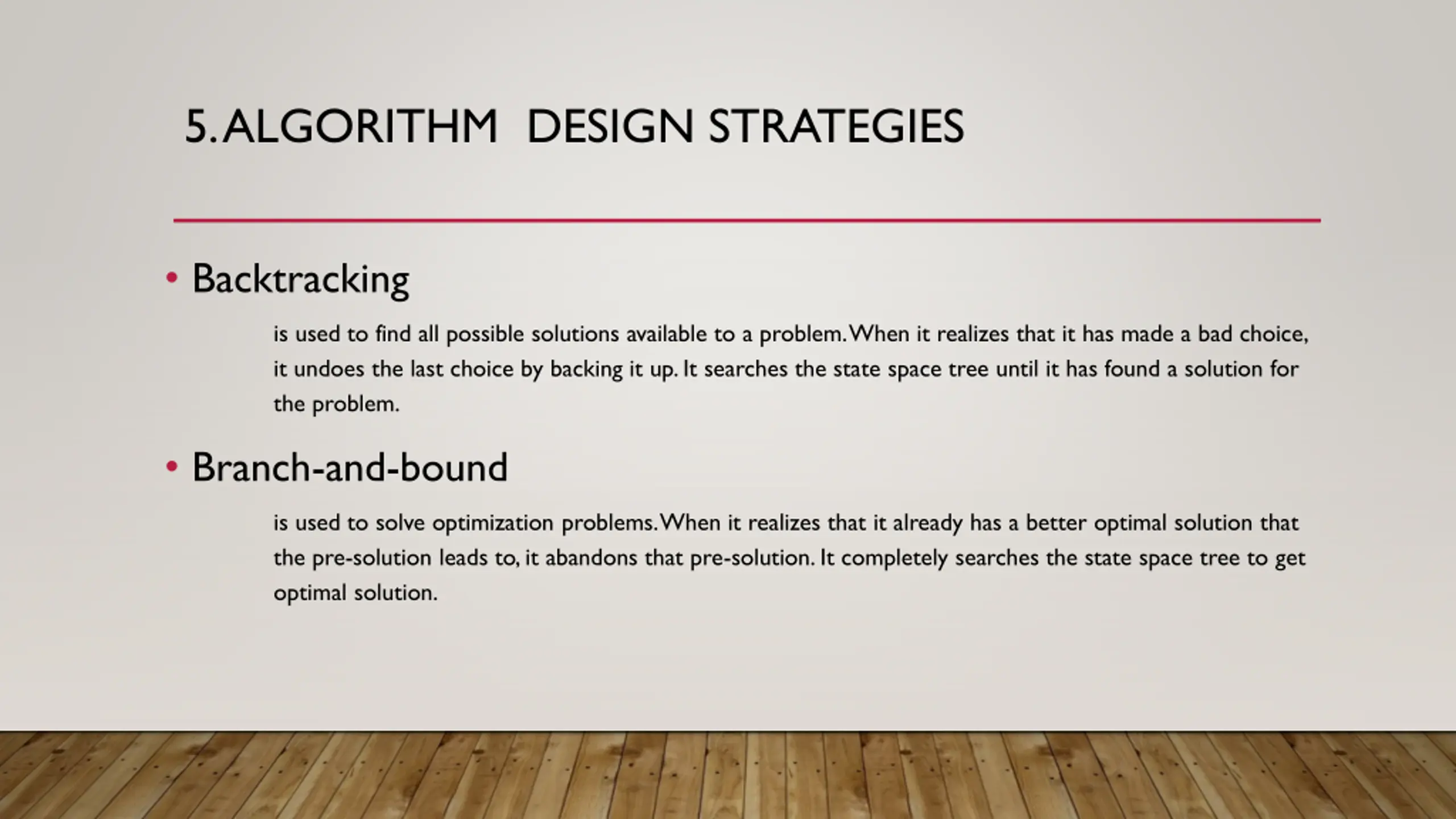 5. ALGORITHM DESIGN STRATEGIES Backtracking is used to find all possible solutions available to a problem. When it realizes that it has made a bad choice, it undoes the last choice by backing it up. It searches the state space tree until it has found a solution for the problem. Branch-and-bound is used to solve optimization problems. When it realizes that it already has a better optimal solution that the pre-solution leads to, it abandons that pre-solution. It completely searches the state space tree to get optimal solution.