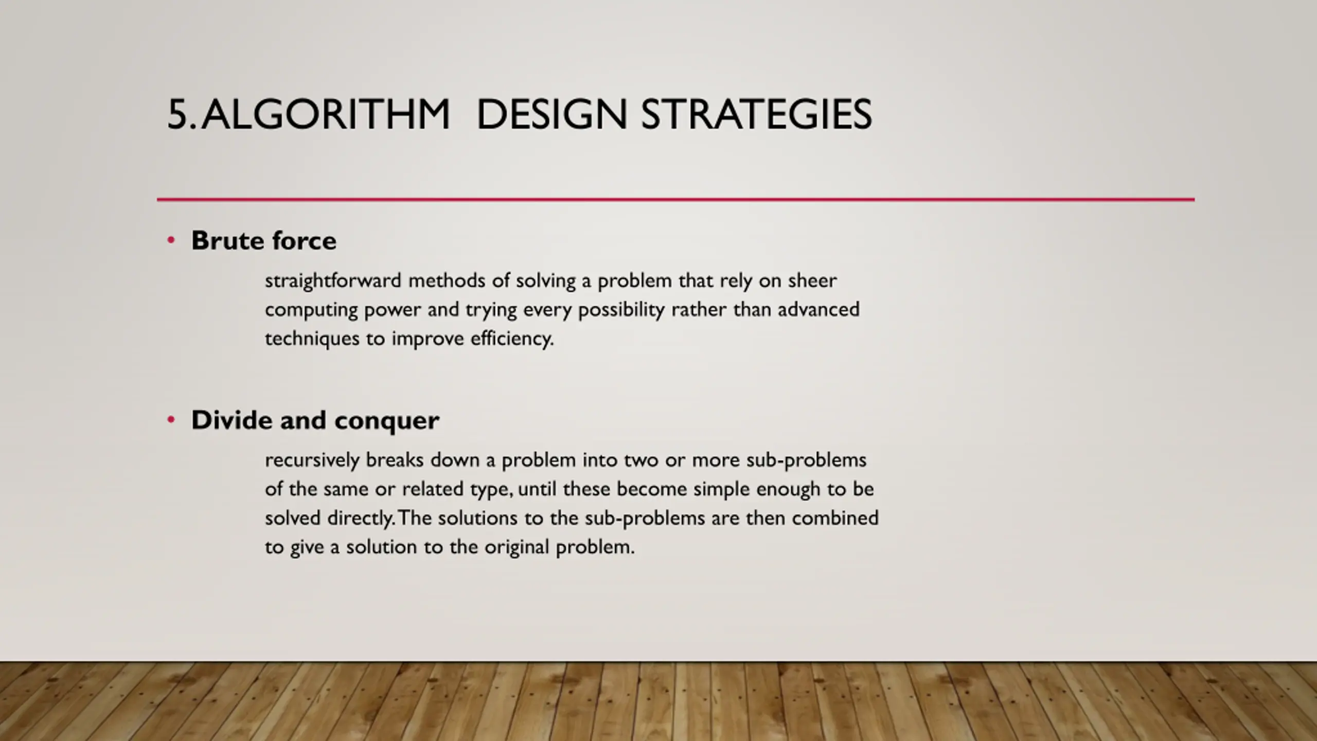 5. ALGORITHM DESIGN STRATEGIES Brute force straightforward methods of solving a problem that rely on sheer computing power and trying every possibility rather than advanced techniques to improve efficiency. Divide and conquer recursively breaks down a problem into two or more sub-problems of the same or related type, until these become simple enough to be solved directly. The solutions to the sub-problems are then combined to give a solution to the original problem.