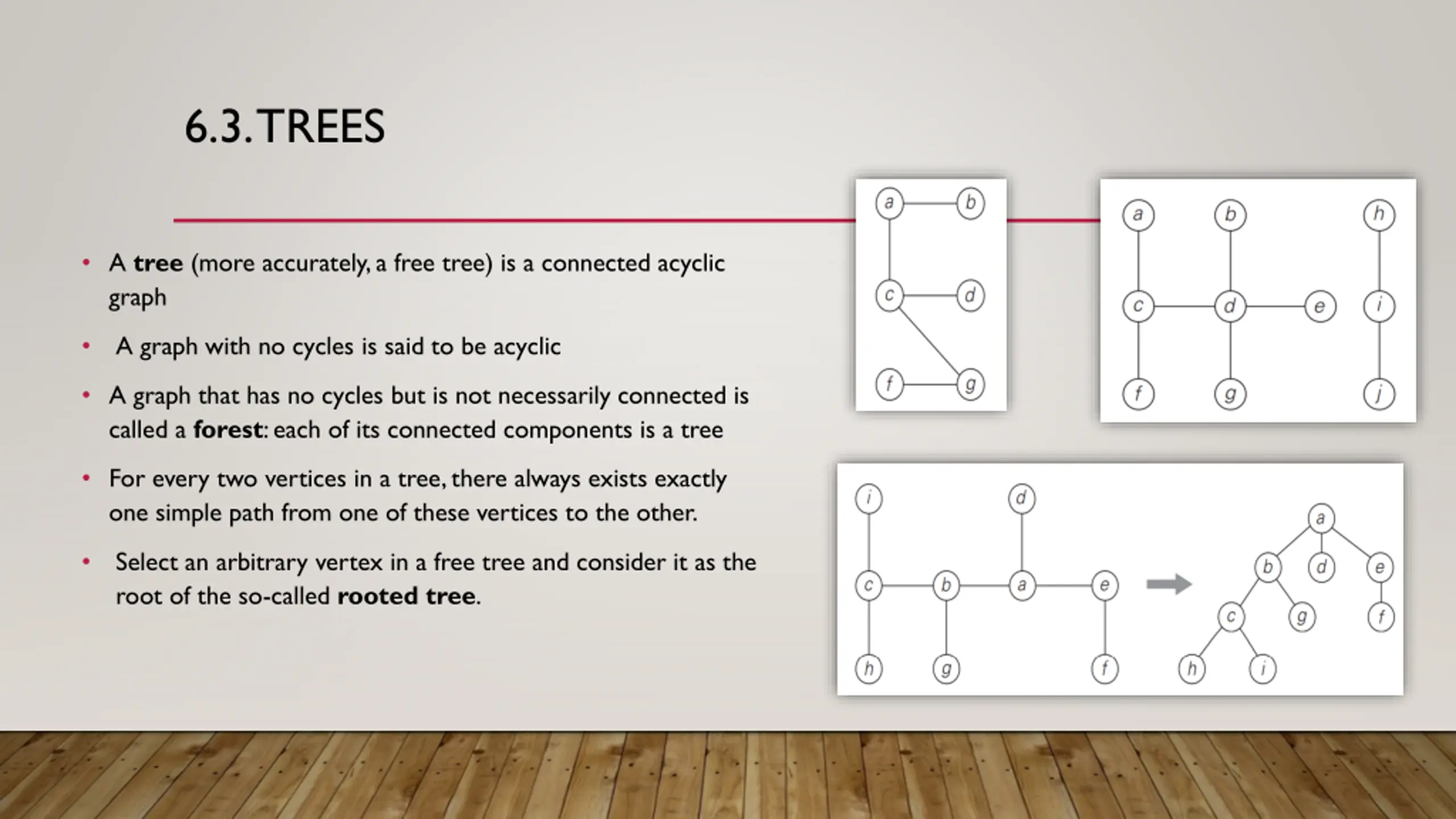 6.3. TREES A tree (more accurately, a free tree) is a connected acyclic graph A graph with no cycles is said to be acyclic A graph that has no cycles but is not necessarily connected is called a forest: each of its connected components is a tree For every two vertices in a tree, there always exists exactly one simple path from one of these vertices to the other. Select an arbitrary vertex in a free tree and consider it as the root of the so-called rooted tree.