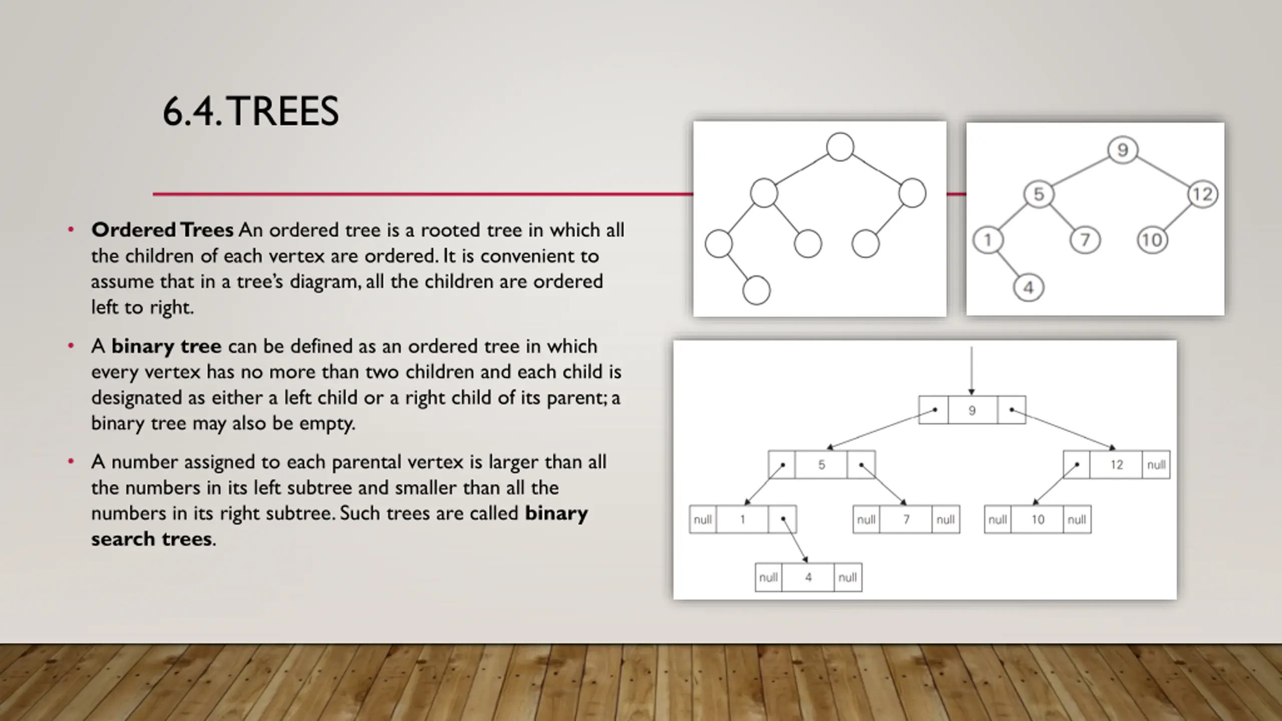 6.4. TREES Ordered Trees An ordered tree is a rooted tree in which all the children of each vertex are ordered. It is convenient to assume that in a tree s diagram, all the children are ordered left to right. A binary tree can be defined as an ordered tree in which every vertex has no more than two children and each child is designated as either a left child or a right child of its parent; a binary tree may also be empty. A number assigned to each parental vertex is larger than all the numbers in its left subtree and smaller than all the numbers in its right subtree. Such trees are called binary search trees.