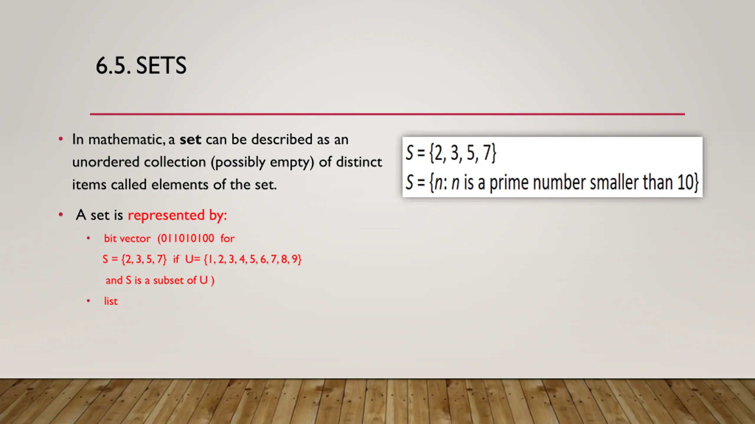 6.5. SETS In mathematic, a set can be described as an unordered collection (possibly empty) of distinct items called elements of the set. A set is represented by: bit vector (011010100 for S = {2, 3, 5, 7} if U= {1, 2, 3, 4, 5, 6, 7, 8, 9} and S is a subset of U ) list