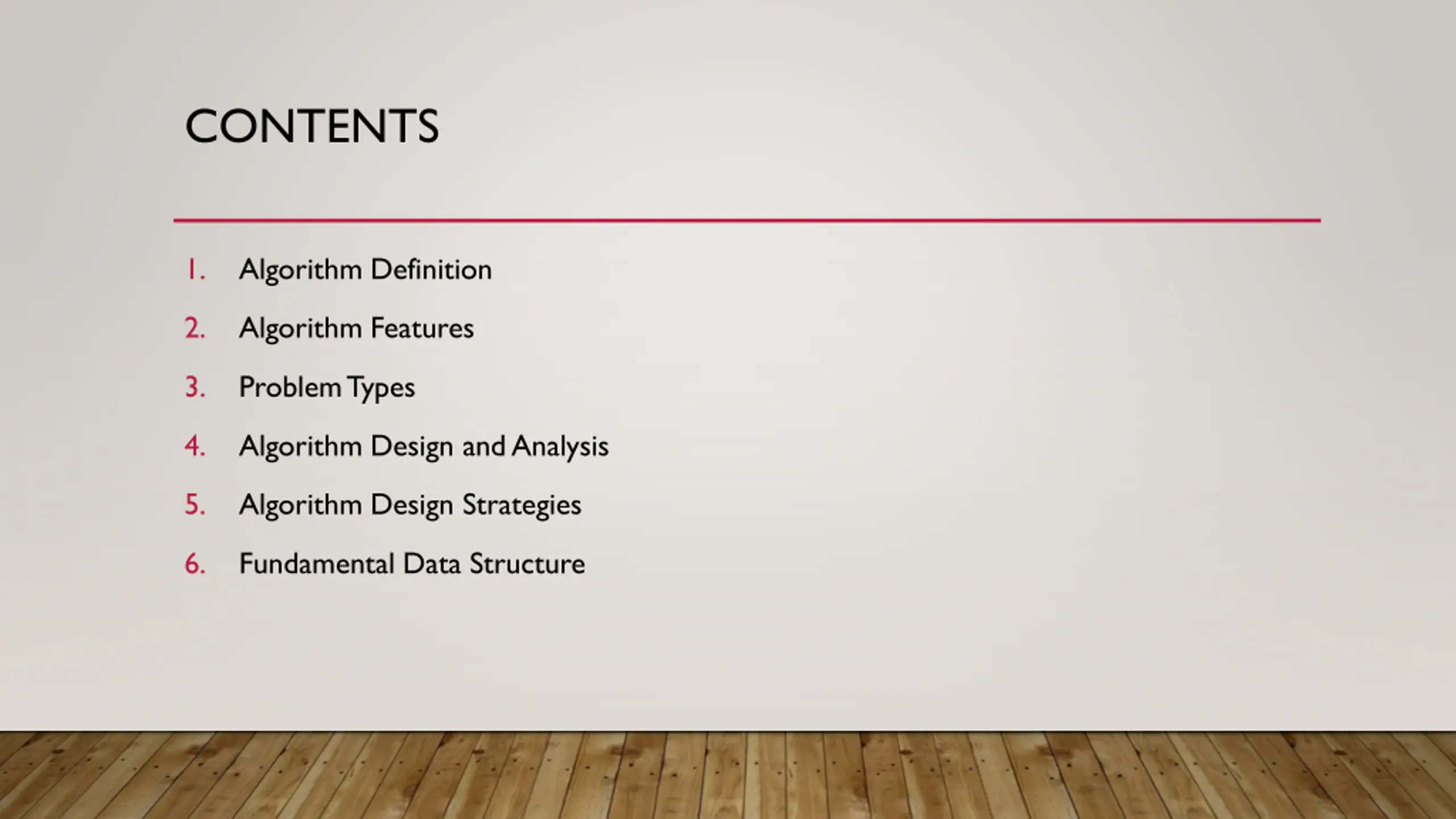 CONTENTS 1. Algorithm Definition 2. Algorithm Features 3. Problem Types 4. Algorithm Design and Analysis 5. Algorithm Design Strategies 6. Fundamental Data Structure