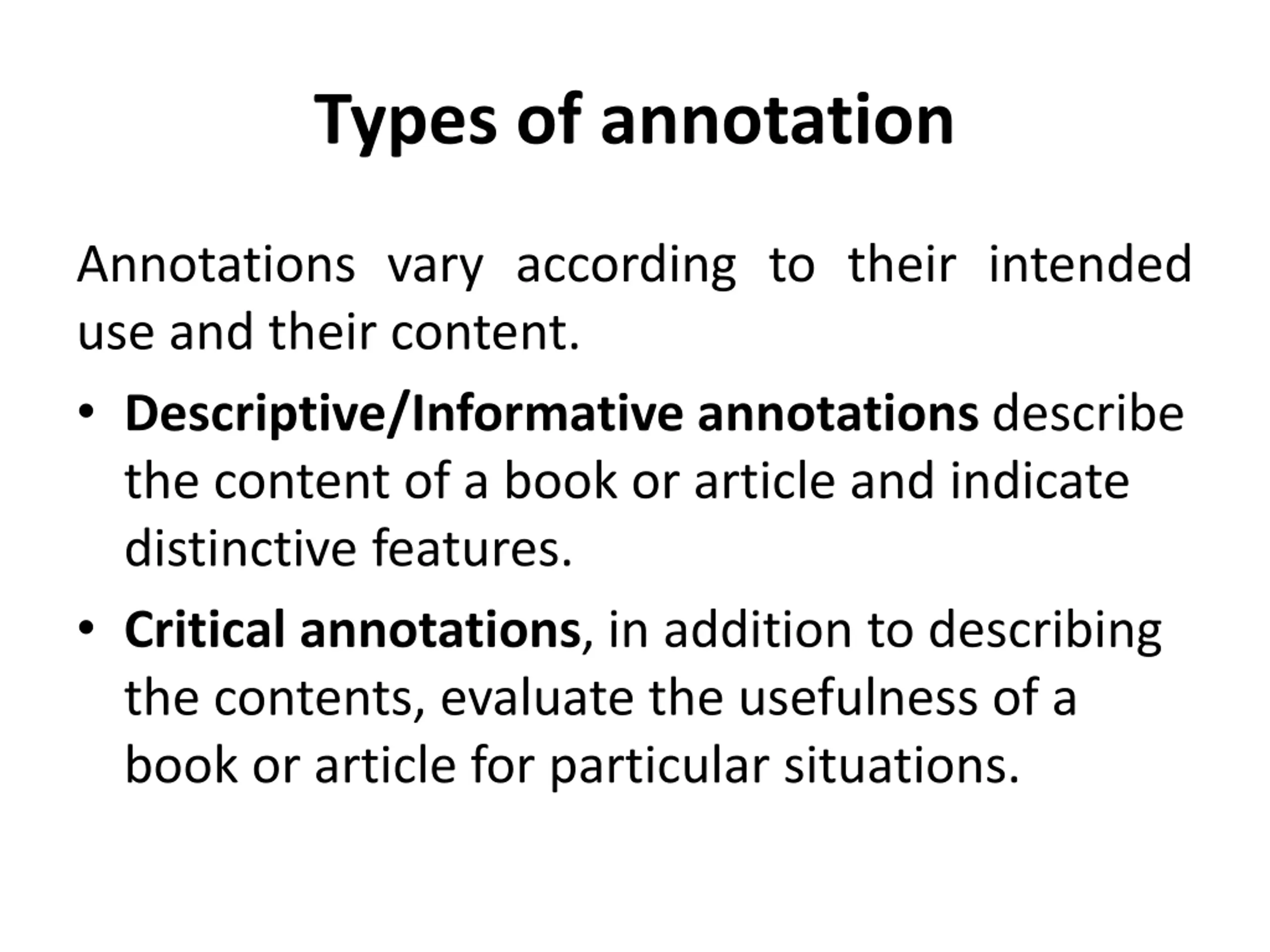 Types of annotation Annotations vary according to their intended use and their content. Descriptive/Informative annotations describe the content of a book or article and indicate distinctive features. Critical annotations, in addition to describing the contents, evaluate the usefulness of a book or article for particular situations.