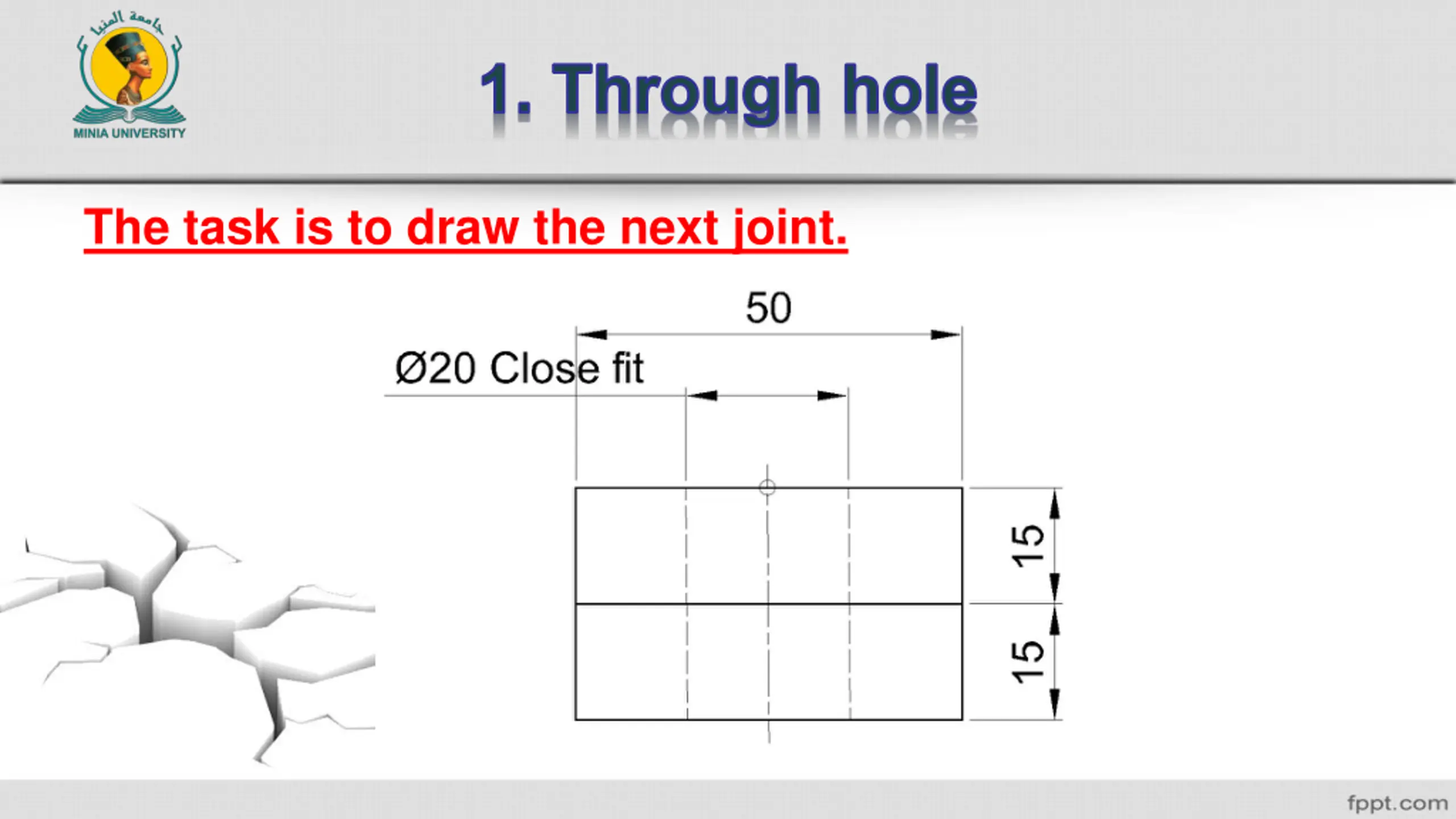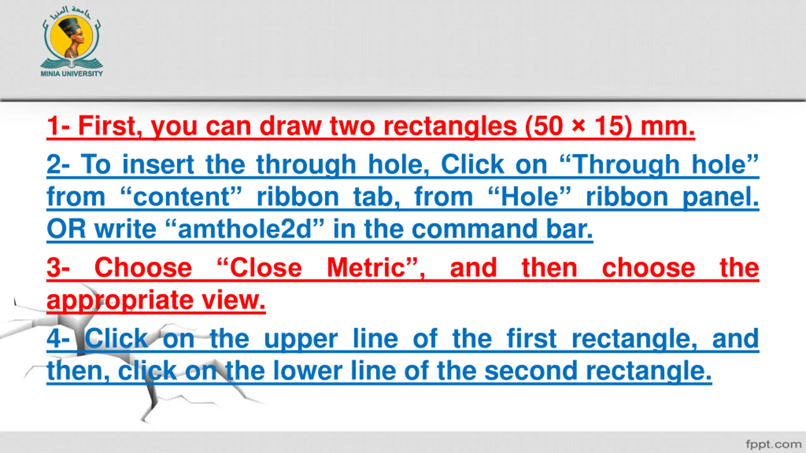 1- First, you can draw two rectangles (50 15) mm. 2- To insert the through hole, Click on Through hole from content ribbon tab, from Hole ribbon panel. OR write amthole2d in the command bar. 3- Choose Close Metric , and then choose the appropriate view. 4- Click on the upper line of the first rectangle, and then, click on the lower line of the second rectangle.