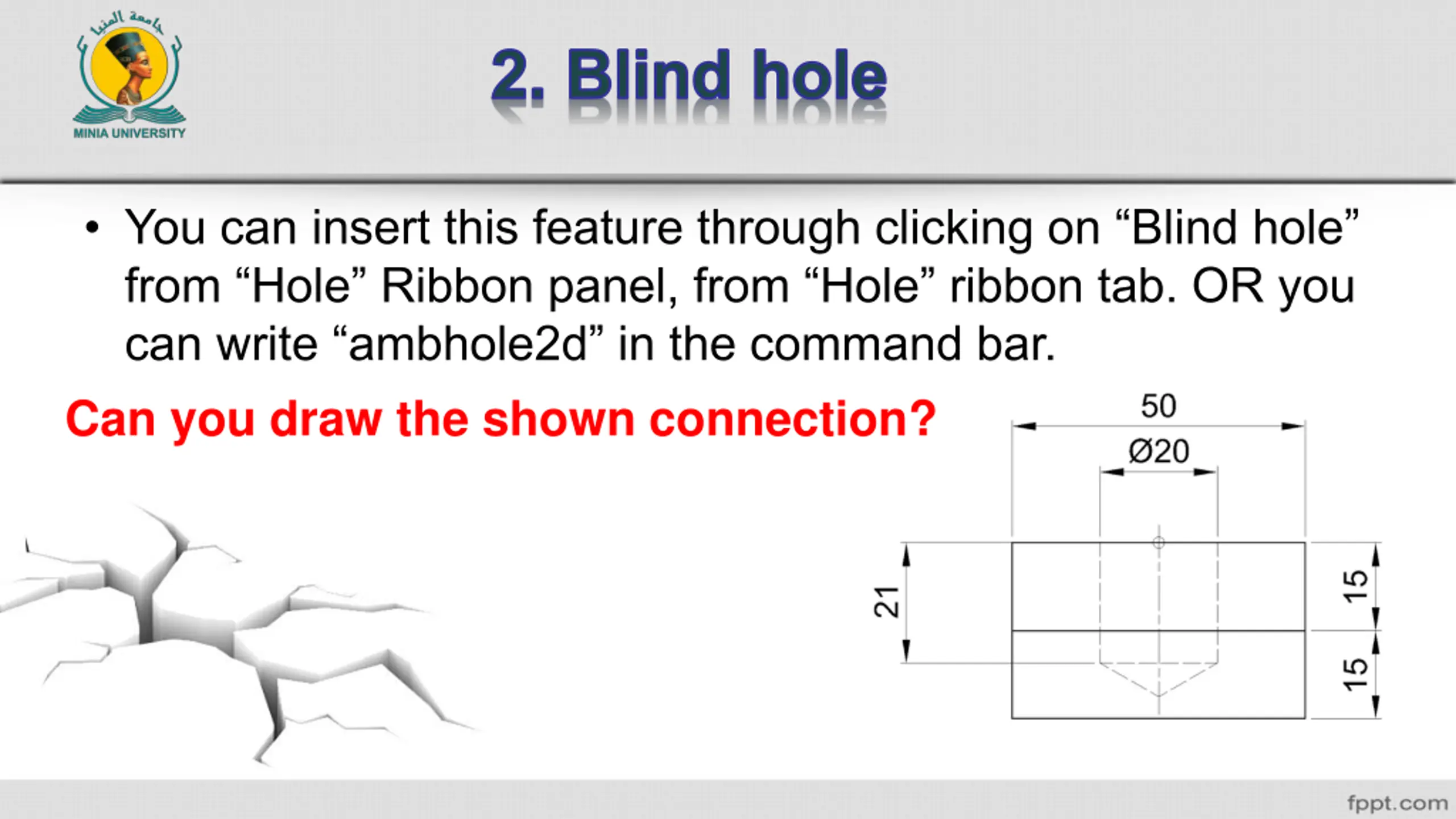 2. Blind hole You can insert this feature through clicking on Blind hole from Hole Ribbon panel, from Hole ribbon tab. OR you can write ambhole2d in the command bar. Can you draw the shown connection?