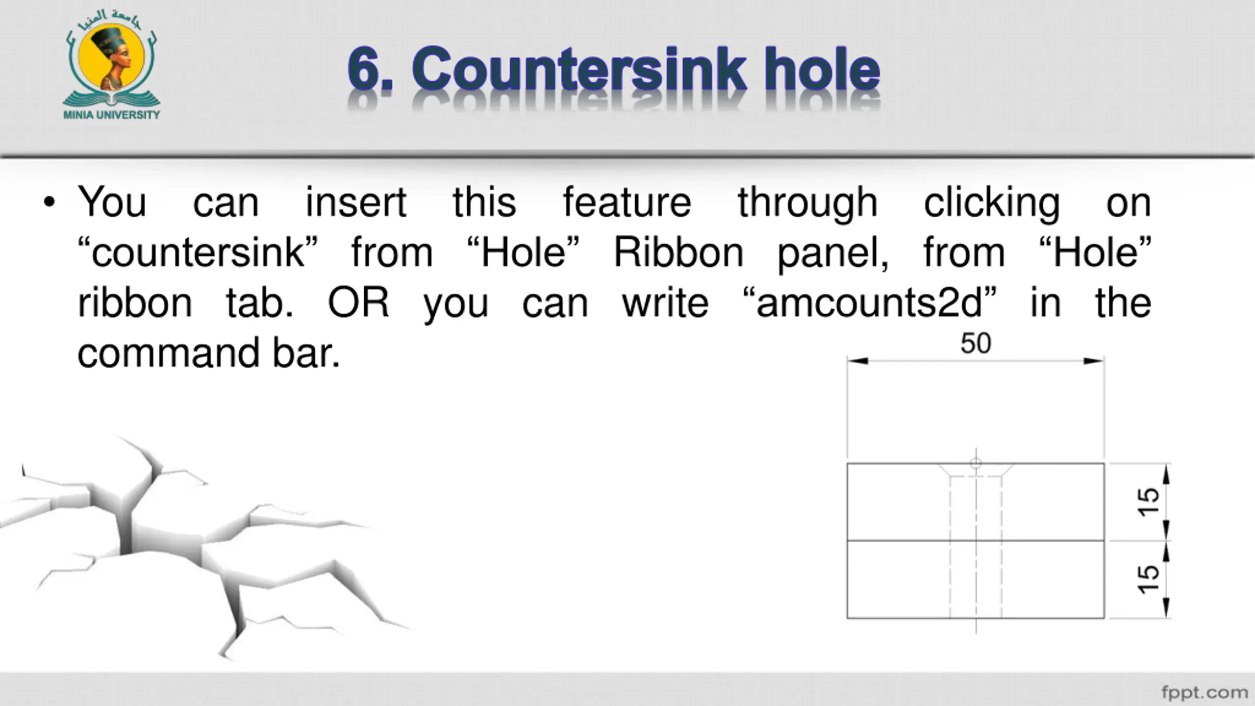 6. Countersink hole You countersink from Hole Ribbon panel, from Hole ribbon tab. OR you can write amcounts2d in the command bar. can insert this feature through clicking on