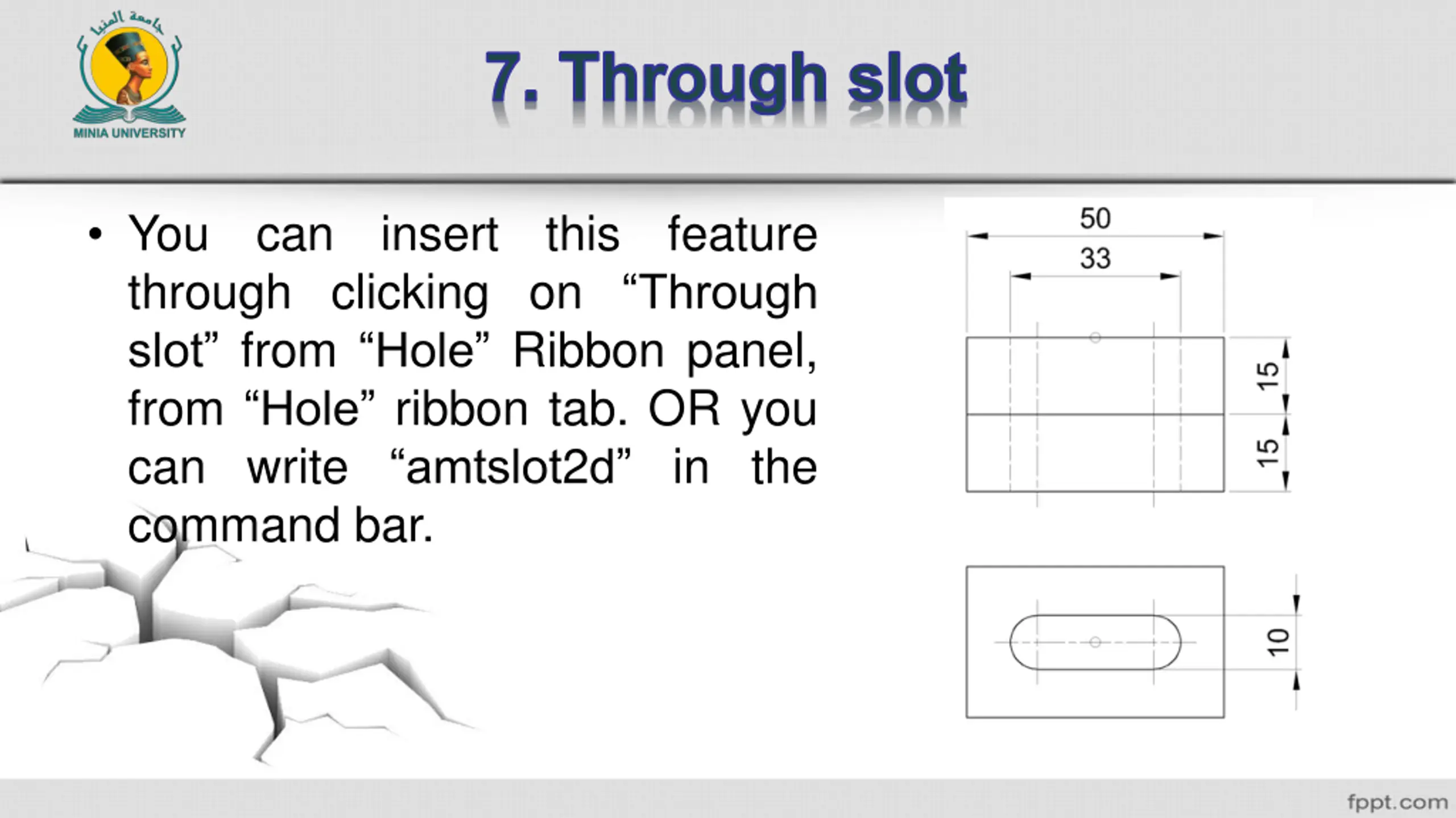 7. Through slot You through clicking on Through slot from Hole Ribbon panel, from Hole ribbon tab. OR you can write amtslot2d in the command bar. can insert this feature