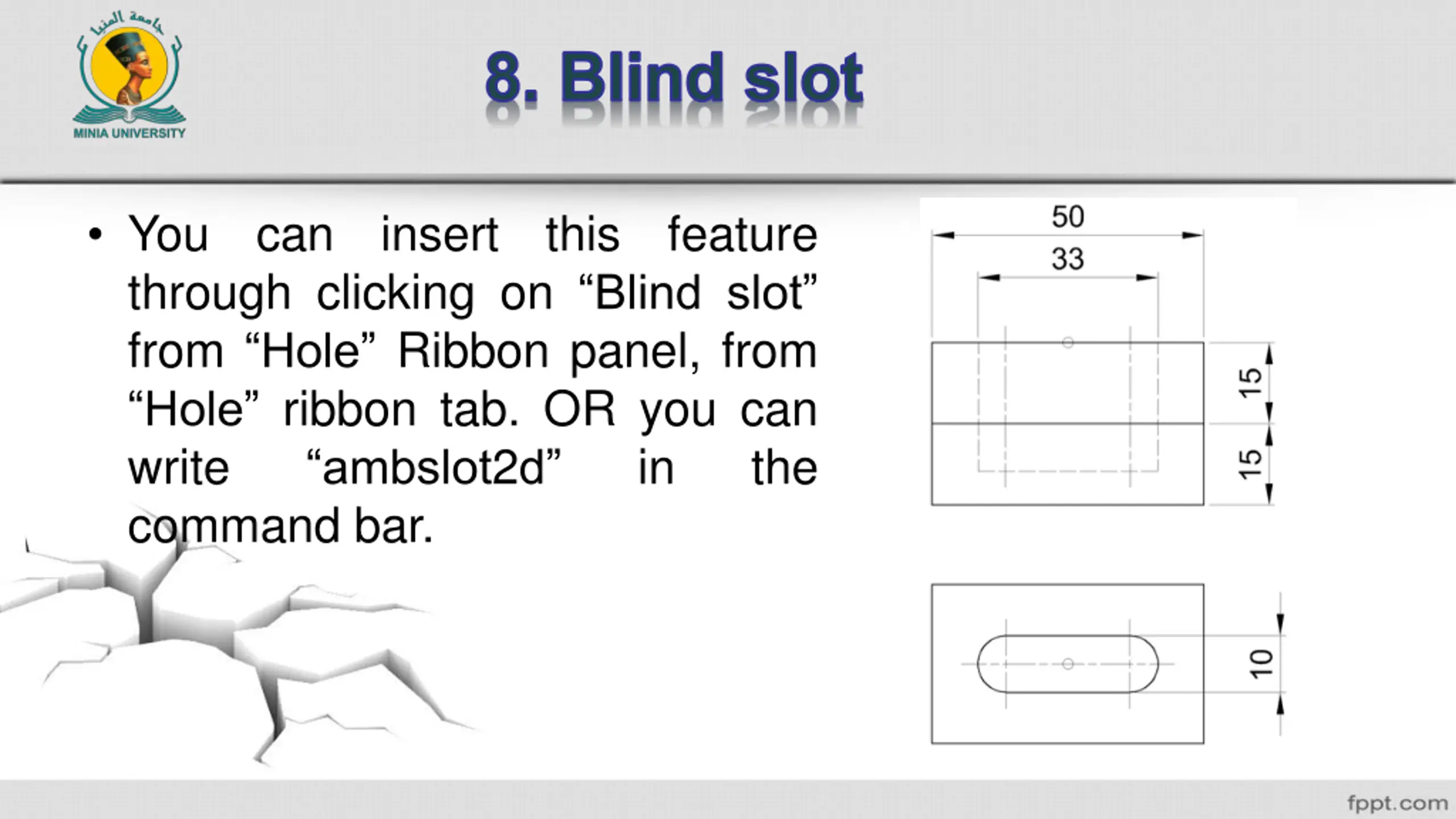 8. Blind slot You through clicking on Blind slot from Hole Ribbon panel, from Hole ribbon tab. OR you can write ambslot2d command bar. can insert this feature in the