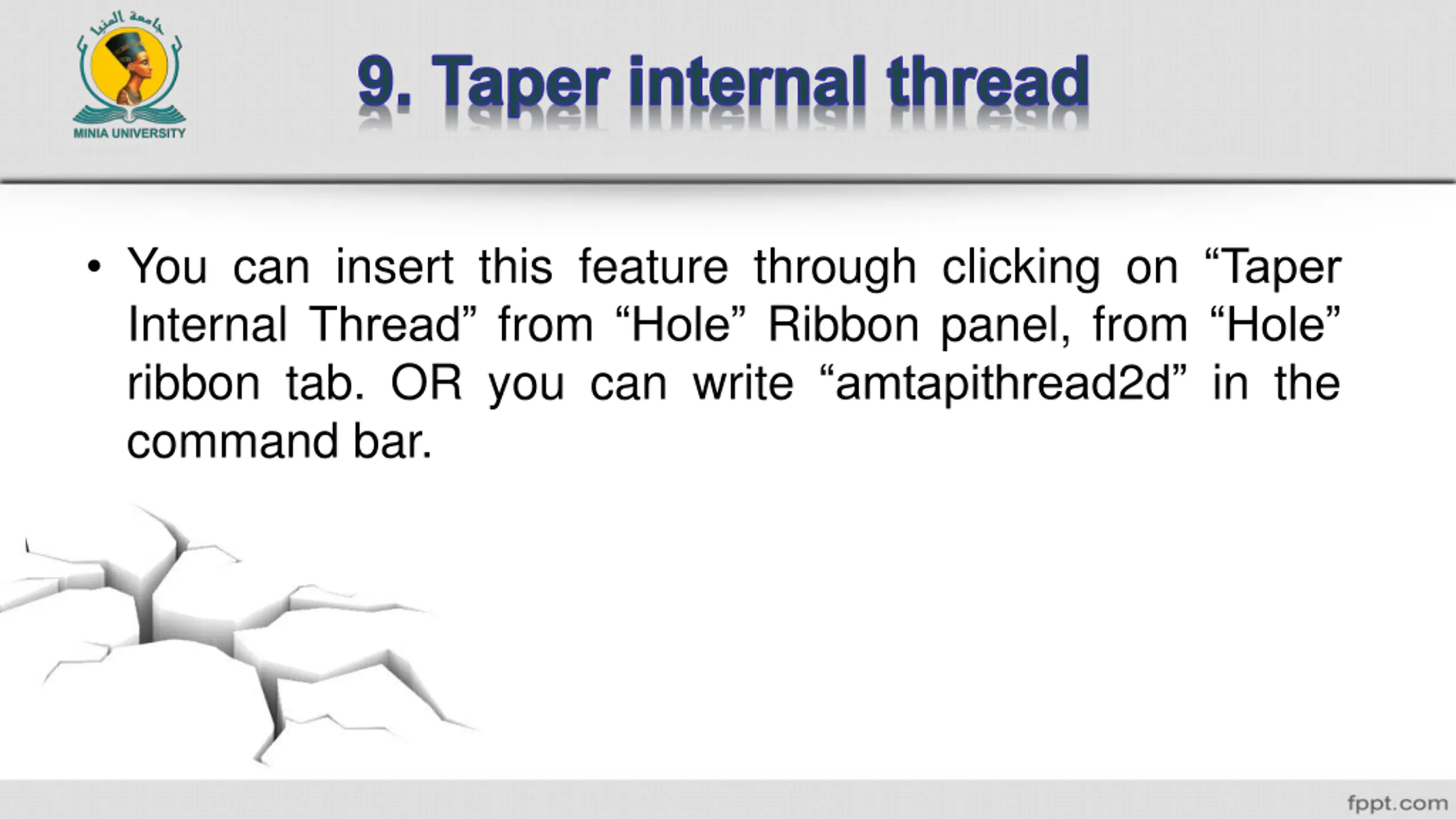 9. Taper internal thread You can insert this feature through clicking on Taper Internal Thread from Hole Ribbon panel, from Hole ribbon tab. OR you can write amtapithread2d in the command bar.