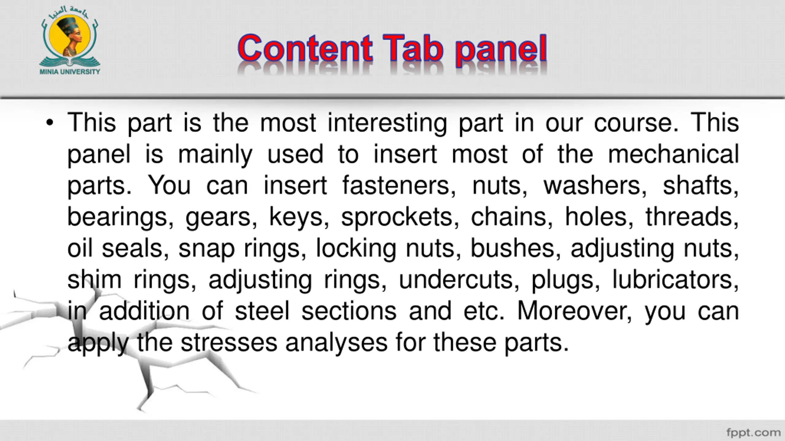 Content Tab panel This part is the most interesting part in our course. This panel is mainly used to insert most of the mechanical parts. You can insert fasteners, nuts, washers, shafts, bearings, gears, keys, sprockets, chains, holes, threads, oil seals, snap rings, locking nuts, bushes, adjusting nuts, shim rings, adjusting rings, undercuts, plugs, lubricators, in addition of steel sections and etc. Moreover, you can apply the stresses analyses for these parts.