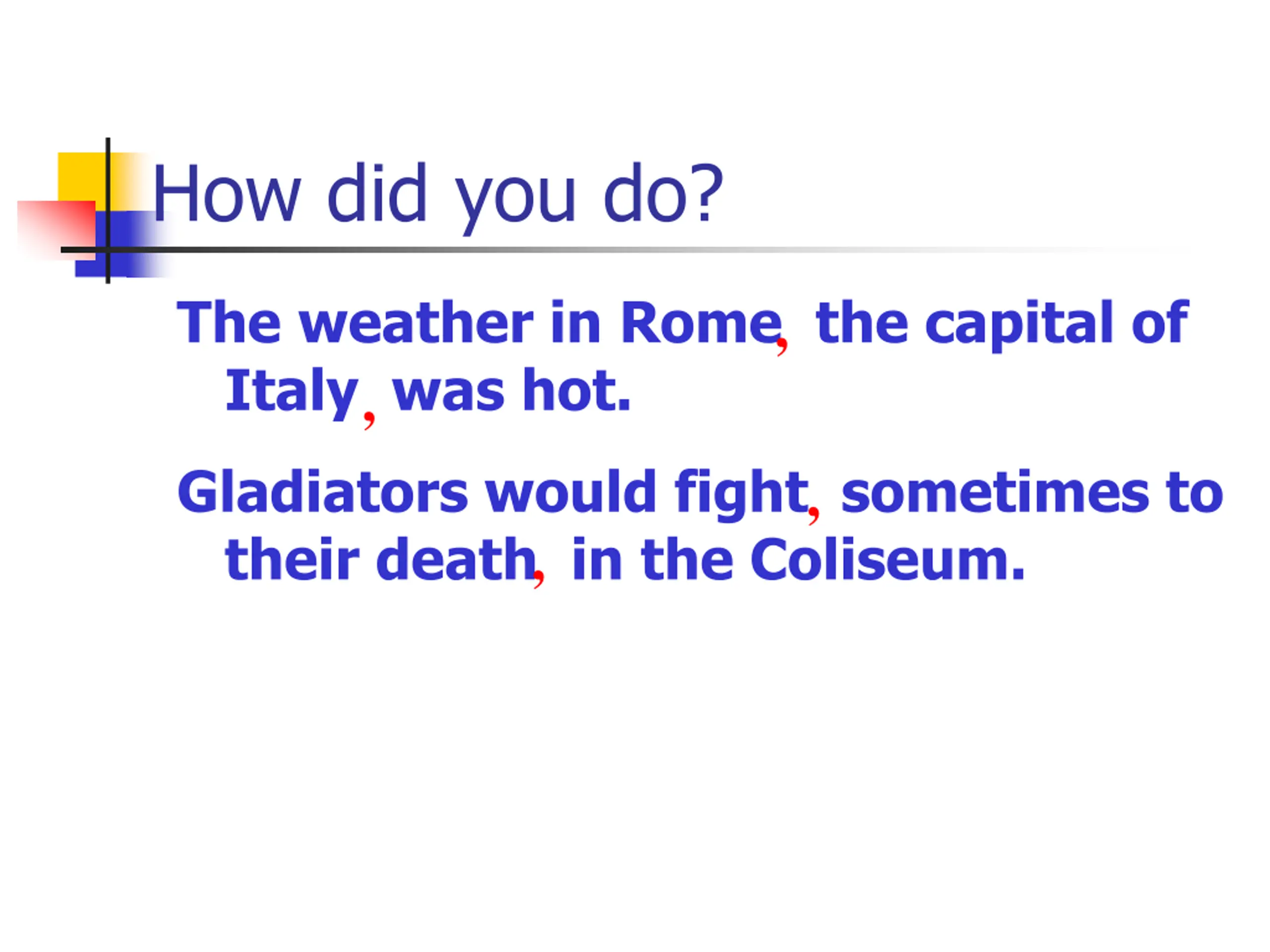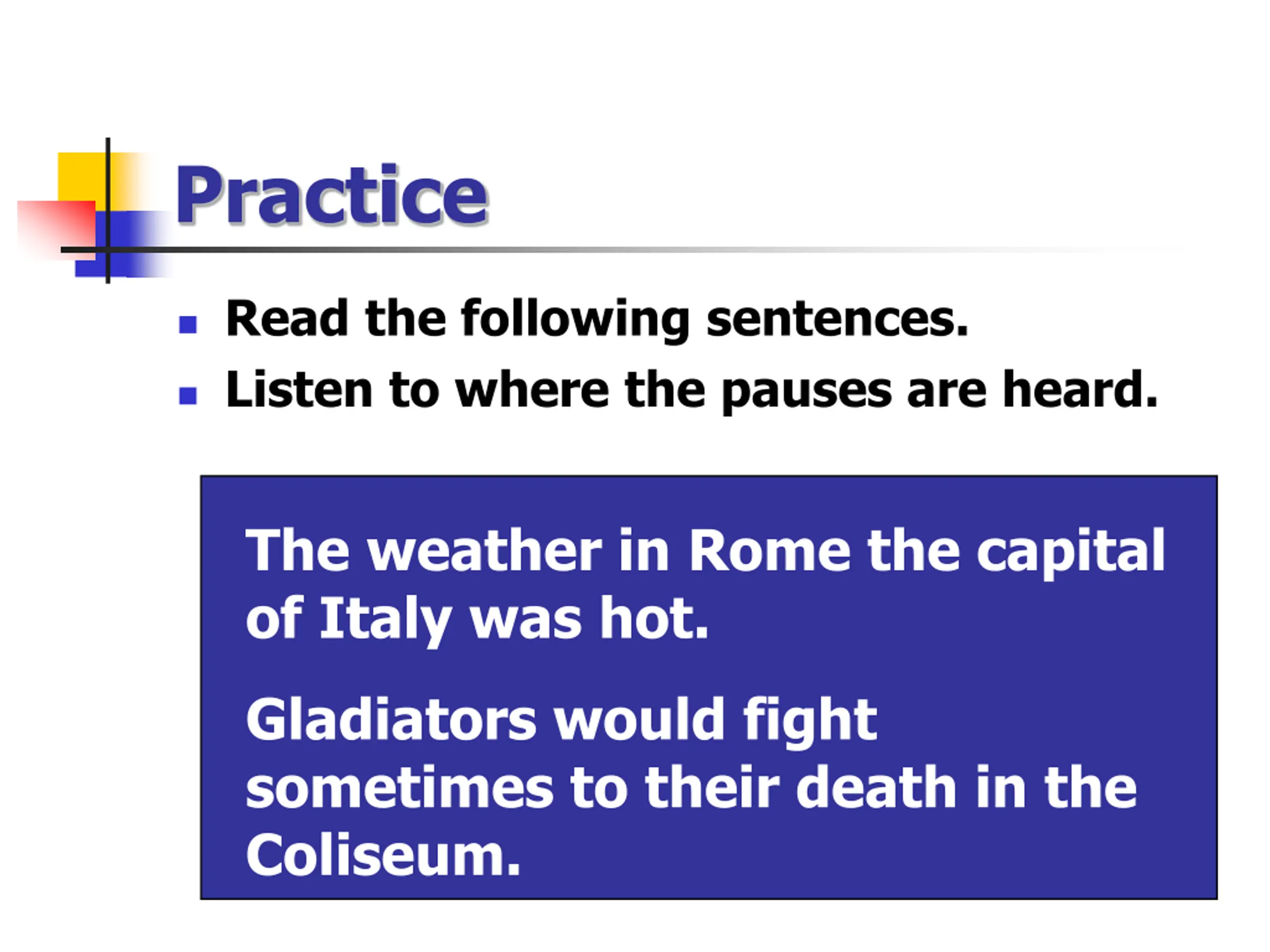 Practice Read the following sentences. Listen to where the pauses are heard. The weather in Rome the capital of Italy was hot. Gladiators would fight sometimes to their death in the Coliseum.