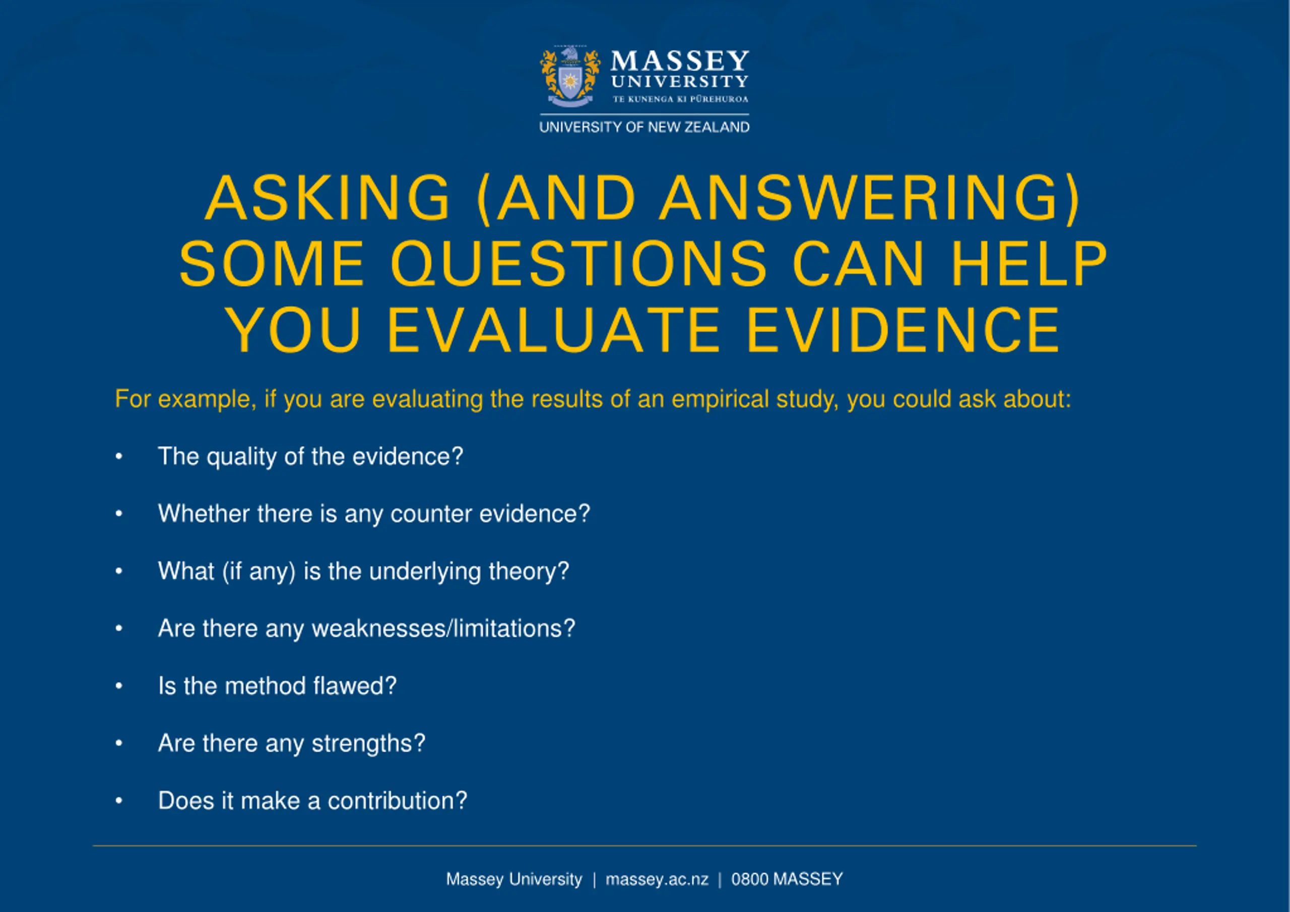 ASKING (AND ANSWERING) SOME QUESTIONS CAN HELP YOU EVALUATE EVIDENCE For example, if you are evaluating the results of an empirical study, you could ask about: The quality of the evidence? Whether there is any counter evidence? What (if any) is the underlying theory? Are there any weaknesses/limitations? Is the method flawed? Are there any strengths? Does it make a contribution? Massey University | massey.ac.nz | 0800 MASSEY