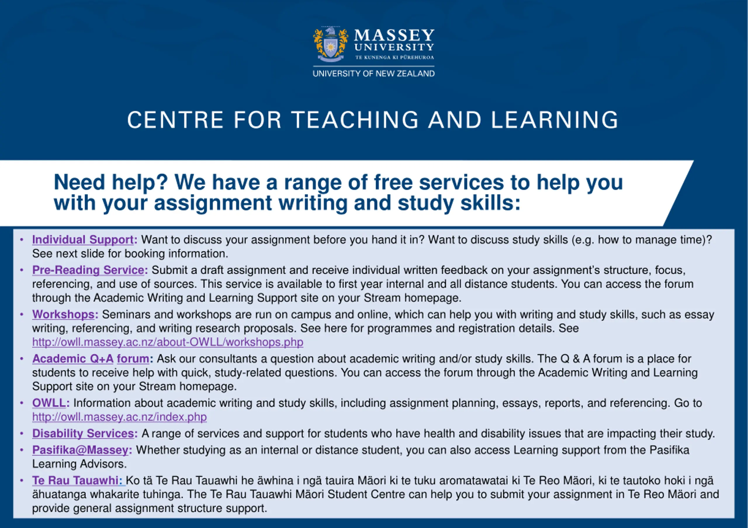 CENTRE FOR TEACHING AND LEARNING Need help? We have a range of free services to help you with your assignment writing and study skills: Individual Support: Want to discuss your assignment before you hand it in? Want to discuss study skills (e.g. how to manage time)? See next slide for booking information. Pre-Reading Service: Submit a draft assignment and receive individual written feedback on your assignment s structure, focus, referencing, and use of sources. This service is available to first year internal and all distance students. You can access the forum through the Academic Writing and Learning Support site on your Stream homepage. Workshops: Seminars and workshops are run on campus and online, which can help you with writing and study skills, such as essay writing, referencing, and writing research proposals. See here for programmes and registration details. See http://owll.massey.ac.nz/about-OWLL/workshops.php Academic Q+A forum: Ask our consultants a question about academic writing and/or study skills. The Q & A forum is a place for students to receive help with quick, study-related questions. You can access the forum through the Academic Writing and Learning Support site on your Stream homepage. OWLL: Information about academic writing and study skills, including assignment planning, essays, reports, and referencing. Go to http://owll.massey.ac.nz/index.php Disability Services: A range of services and support for students who have health and disability issues that are impacting their study. Pasifika@Massey: Whether studying as an internal or distance student, you can also access Learning support from the Pasifika Learning Advisors. Te Rau Tauawhi: Ko t Te Rau Tauawhi he whina i ng tauira M ori ki te tuku aromatawatai ki Te Reo M ori, ki te tautoko hoki i ng huatanga whakarite tuhinga. The Te Rau Tauawhi M ori Student Centre can help you to submit your assignment in Te Reo M ori and provide general assignment structure support. Massey University | massey.ac.nz | 0800 MASSEY