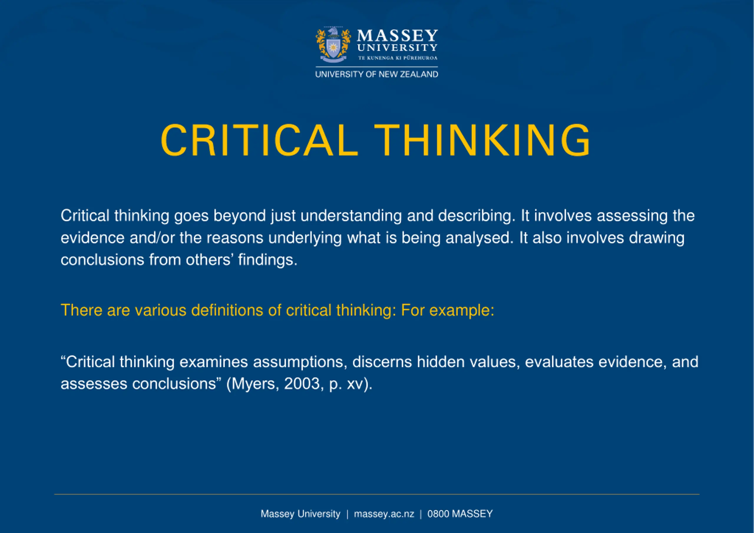 CRITICAL THINKING Critical thinking goes beyond just understanding and describing. It involves assessing the evidence and/or the reasons underlying what is being analysed. It also involves drawing conclusions from others findings. There are various definitions of critical thinking: For example: Critical thinking examines assumptions, discerns hidden values, evaluates evidence, and assesses conclusions (Myers, 2003, p. xv). Massey University | massey.ac.nz | 0800 MASSEY