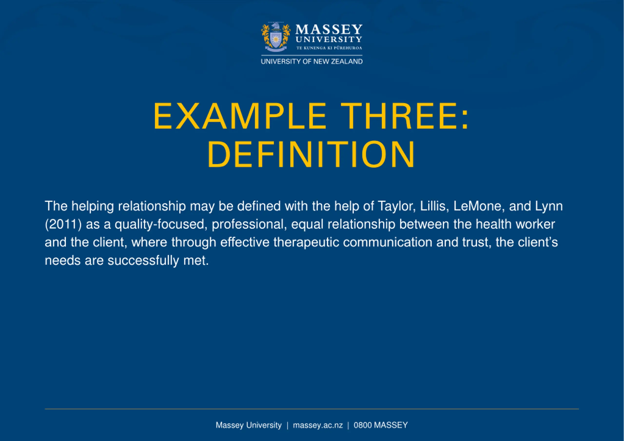EXAMPLE THREE: DEFINITION The helping relationship may be defined with the help of Taylor, Lillis, LeMone, and Lynn (2011) as a quality-focused, professional, equal relationship between the health worker and the client, where through effective therapeutic communication and trust, the client s needs are successfully met. Massey University | massey.ac.nz | 0800 MASSEY