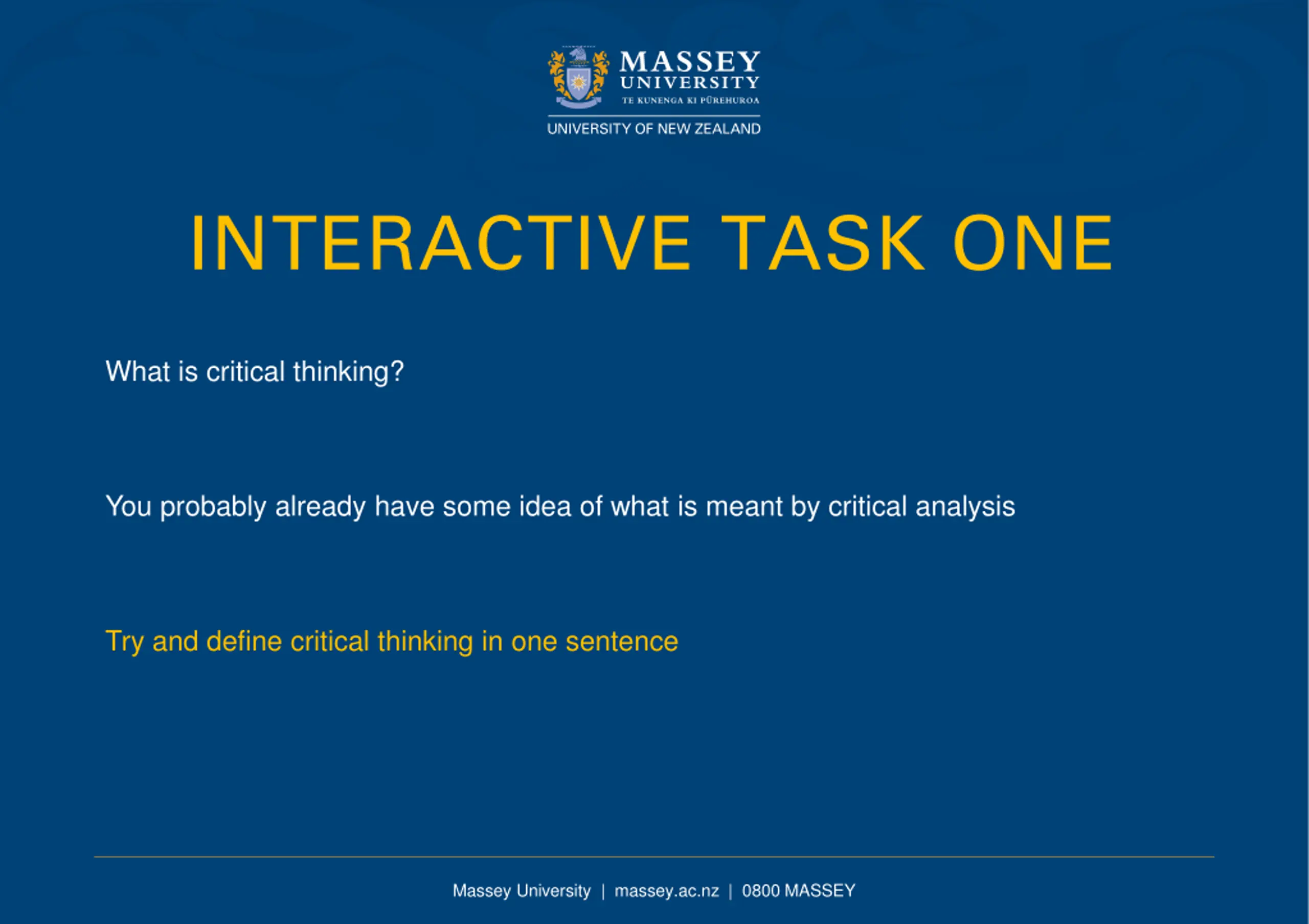 INTERACTIVE TASK ONE What is critical thinking? You probably already have some idea of what is meant by critical analysis Try and define critical thinking in one sentence Massey University | massey.ac.nz | 0800 MASSEY
