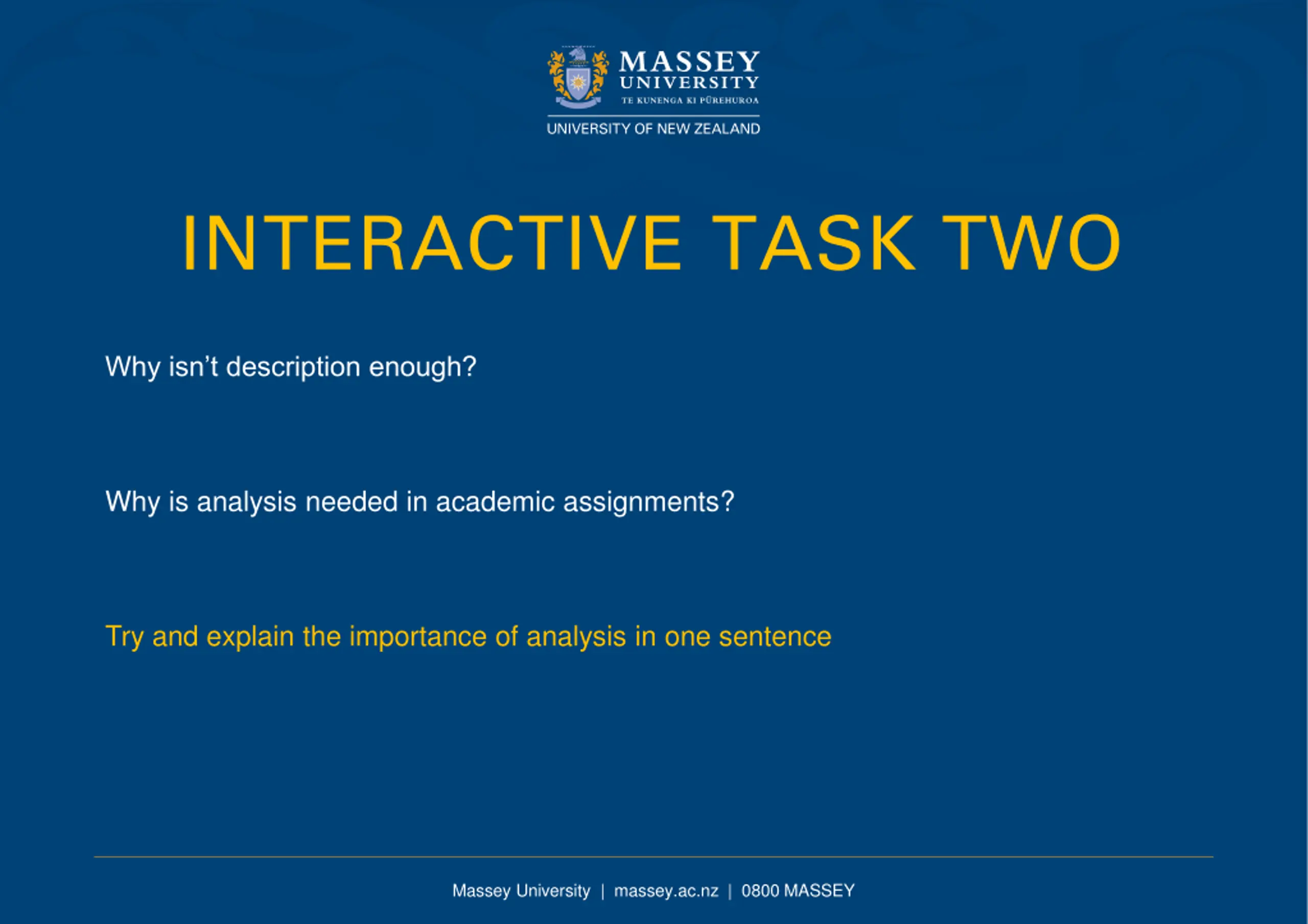 INTERACTIVE TASK TWO Why isn t description enough? Why is analysis needed in academic assignments? Try and explain the importance of analysis in one sentence Massey University | massey.ac.nz | 0800 MASSEY
