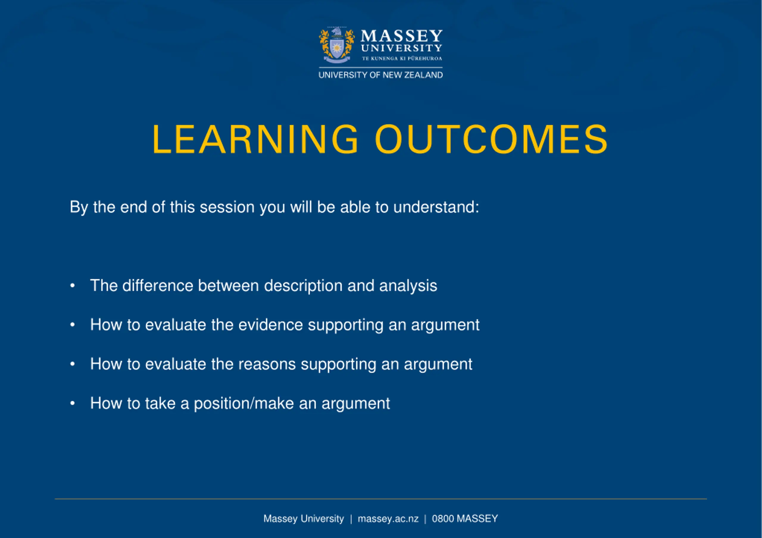 LEARNING OUTCOMES By the end of this session you will be able to understand: The difference between description and analysis How to evaluate the evidence supporting an argument How to evaluate the reasons supporting an argument How to take a position/make an argument Massey University | massey.ac.nz | 0800 MASSEY