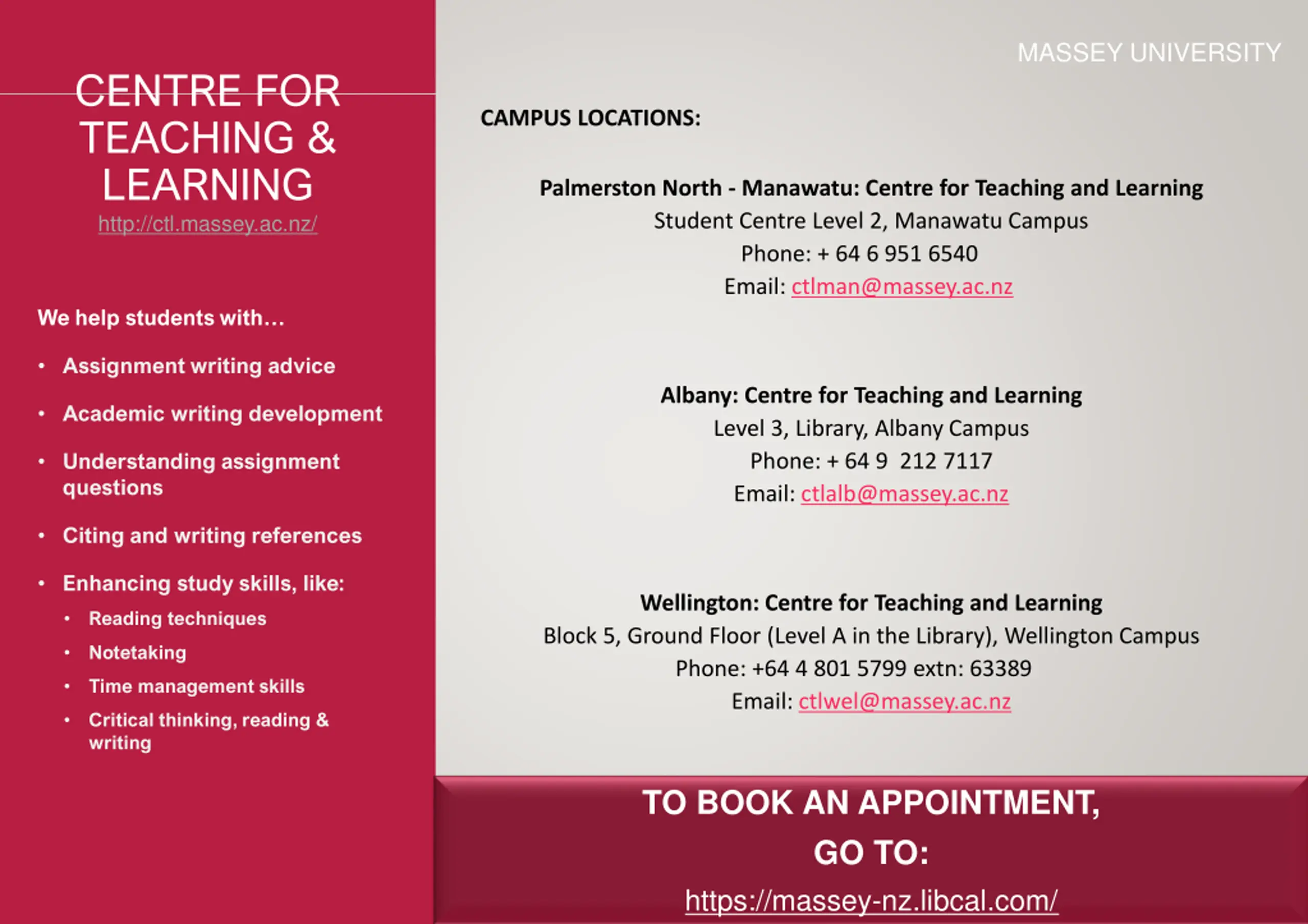 MASSEY UNIVERSITY CENTRE FOR TEACHING & LEARNING http://ctl.massey.ac.nz/ CAMPUS LOCATIONS: Palmerston North - Manawatu: Centre for Teaching and Learning Student Centre Level 2, Manawatu Campus Phone: + 64 6 951 6540 Email: ctlman@massey.ac.nz We help students with Assignment writing advice Albany: Centre for Teaching and Learning Level 3, Library, Albany Campus Phone: + 64 9 212 7117 Email: ctlalb@massey.ac.nz Academic writing development Understanding assignment questions Citing and writing references Enhancing study skills, like: Wellington: Centre for Teaching and Learning Block 5, Ground Floor (Level A in the Library), Wellington Campus Phone: +64 4 801 5799 extn: 63389 Email: ctlwel@massey.ac.nz Reading techniques Notetaking Time management skills Critical thinking, reading & writing TO BOOK AN APPOINTMENT, GO TO: https://massey-nz.libcal.com/