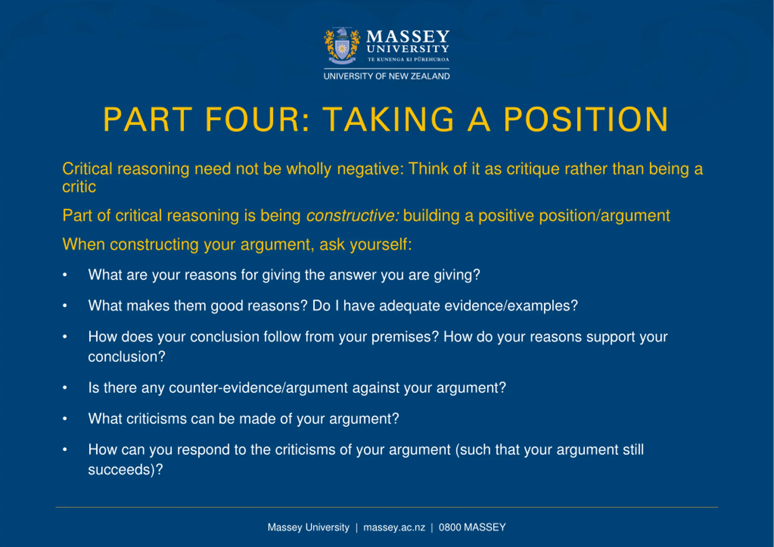 PART FOUR: TAKING A POSITION Critical reasoning need not be wholly negative: Think of it as critique rather than being a critic Part of critical reasoning is being constructive: building a positive position/argument When constructing your argument, ask yourself: What are your reasons for giving the answer you are giving? What makes them good reasons? Do I have adequate evidence/examples? How does your conclusion follow from your premises? How do your reasons support your conclusion? Is there any counter-evidence/argument against your argument? What criticisms can be made of your argument? How can you respond to the criticisms of your argument (such that your argument still succeeds)? Massey University | massey.ac.nz | 0800 MASSEY