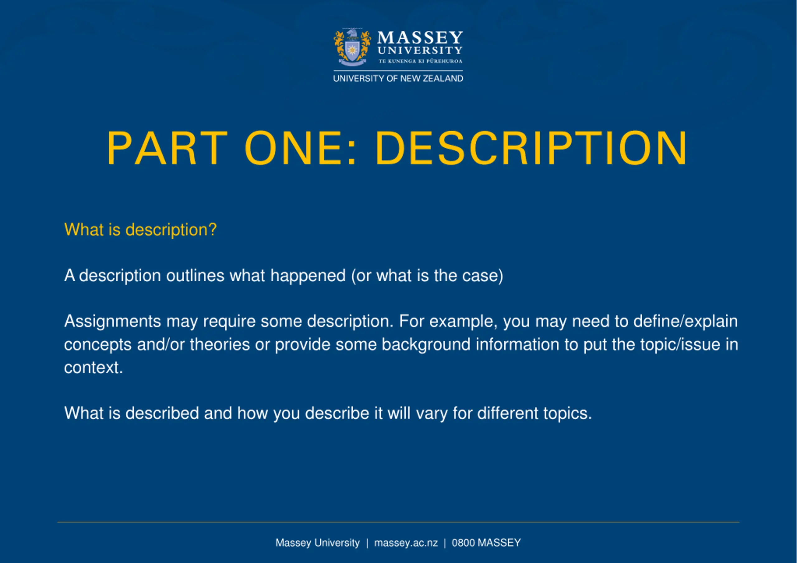 PART ONE: DESCRIPTION What is description? A description outlines what happened (or what is the case) Assignments may require some description. For example, you may need to define/explain concepts and/or theories or provide some background information to put the topic/issue in context. What is described and how you describe it will vary for different topics. Massey University | massey.ac.nz | 0800 MASSEY