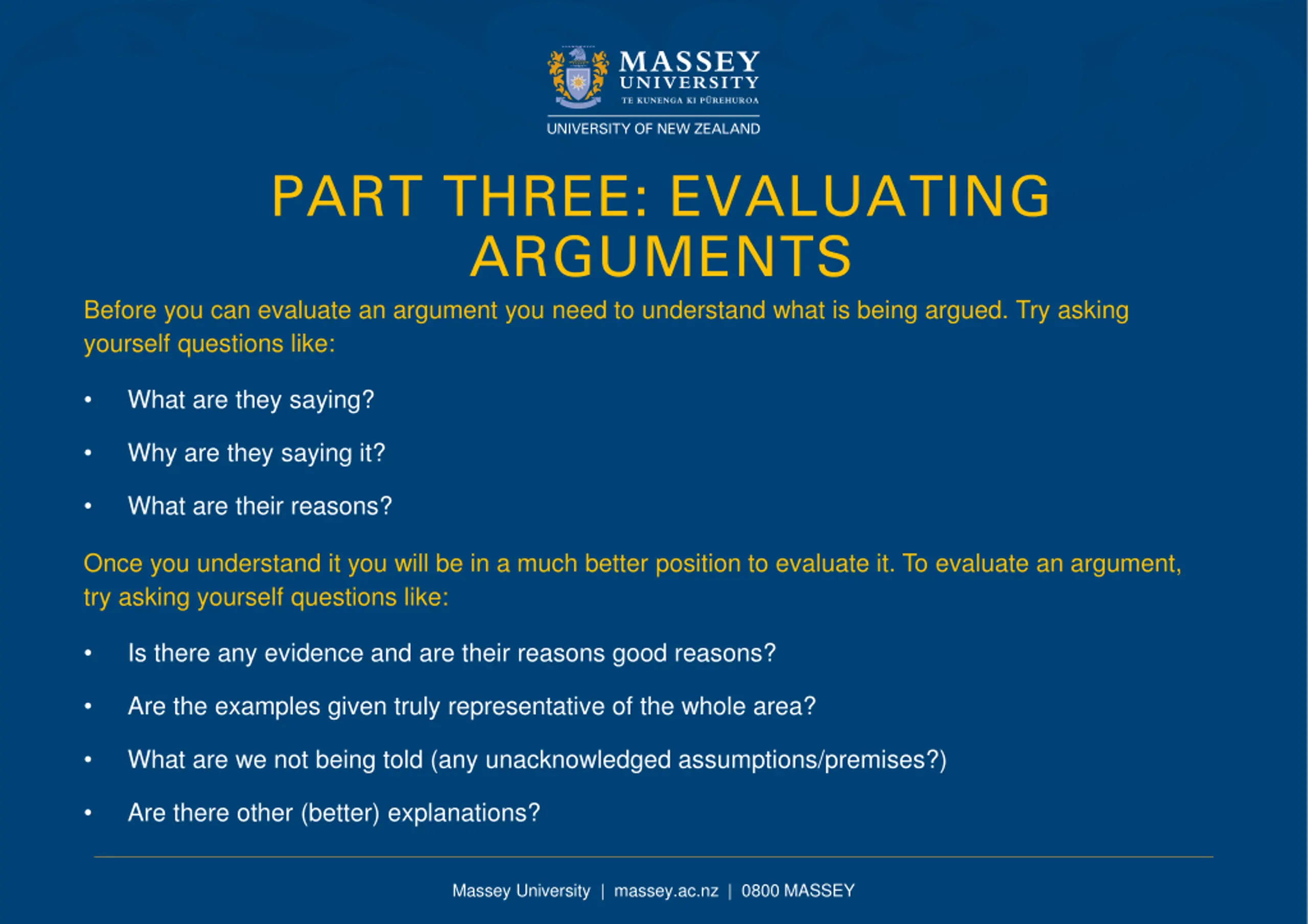 PART THREE: EVALUATING ARGUMENTS Before you can evaluate an argument you need to understand what is being argued. Try asking yourself questions like: What are they saying? Why are they saying it? What are their reasons? Once you understand it you will be in a much better position to evaluate it. To evaluate an argument, try asking yourself questions like: Is there any evidence and are their reasons good reasons? Are the examples given truly representative of the whole area? What are we not being told (any unacknowledged assumptions/premises?) Are there other (better) explanations? Massey University | massey.ac.nz | 0800 MASSEY