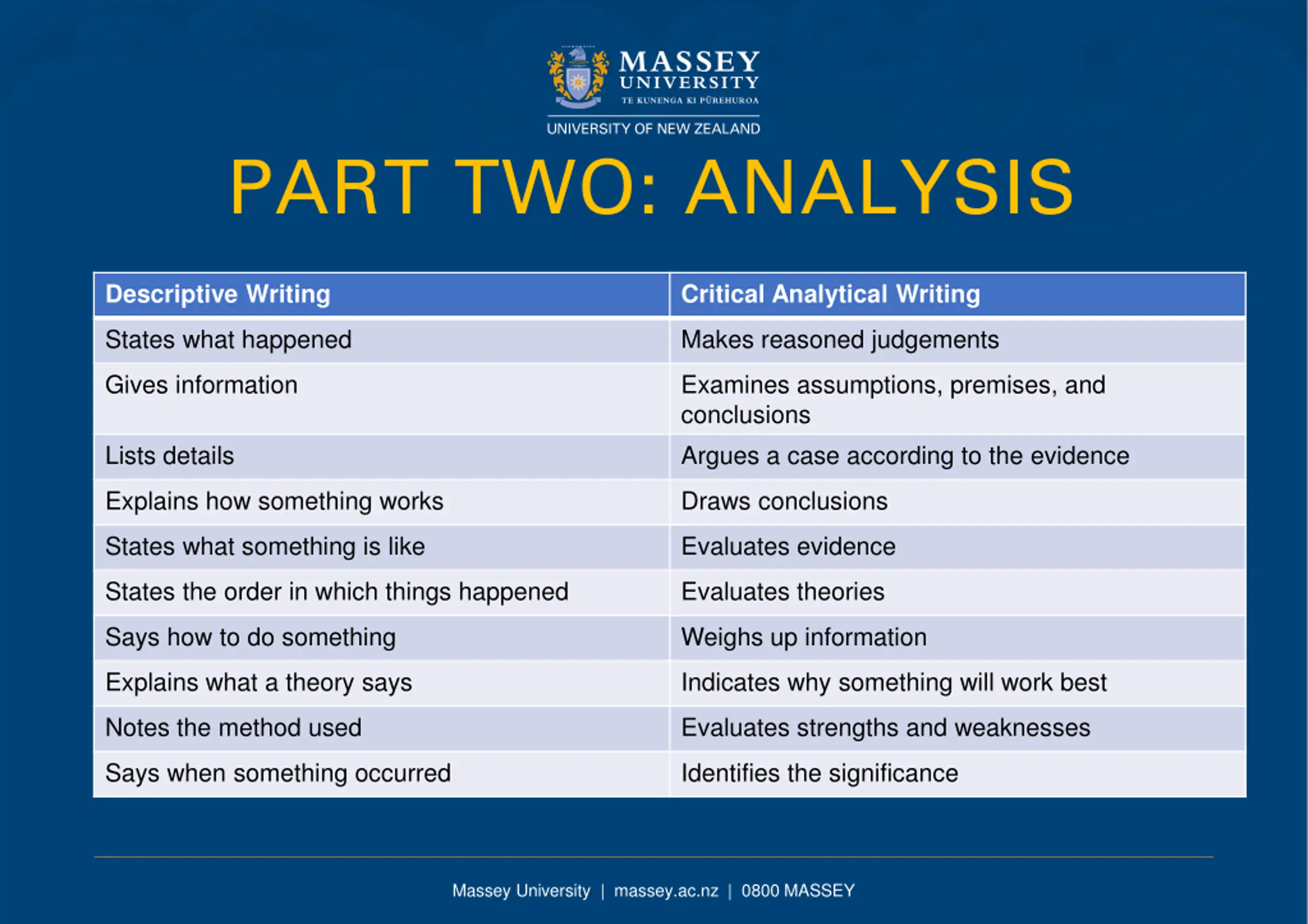 PART TWO: ANALYSIS Descriptive Writing Critical Analytical Writing States what happened Makes reasoned judgements Gives information Examines assumptions, premises, and conclusions Argues a case according to the evidence Lists details Explains how something works Draws conclusions States what something is like Evaluates evidence States the order in which things happened Evaluates theories Says how to do something Weighs up information Explains what a theory says Indicates why something will work best Notes the method used Evaluates strengths and weaknesses Says when something occurred Identifies the significance Massey University | massey.ac.nz | 0800 MASSEY