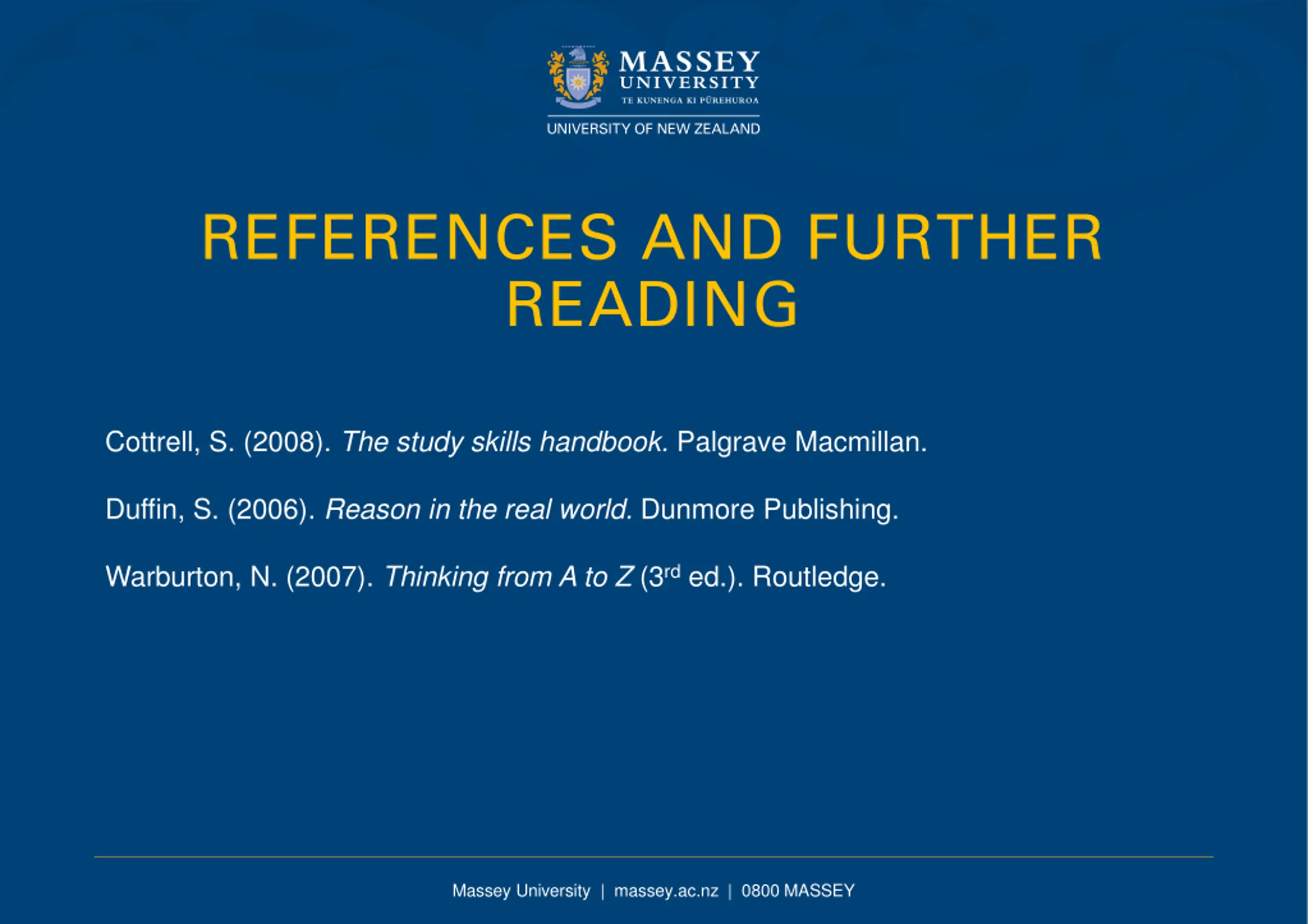 REFERENCES AND FURTHER READING Cottrell, S. (2008). The study skills handbook. Palgrave Macmillan. Duffin, S. (2006). Reason in the real world. Dunmore Publishing. Warburton, N. (2007). Thinking from A to Z (3rd ed.). Routledge. Massey University | massey.ac.nz | 0800 MASSEY