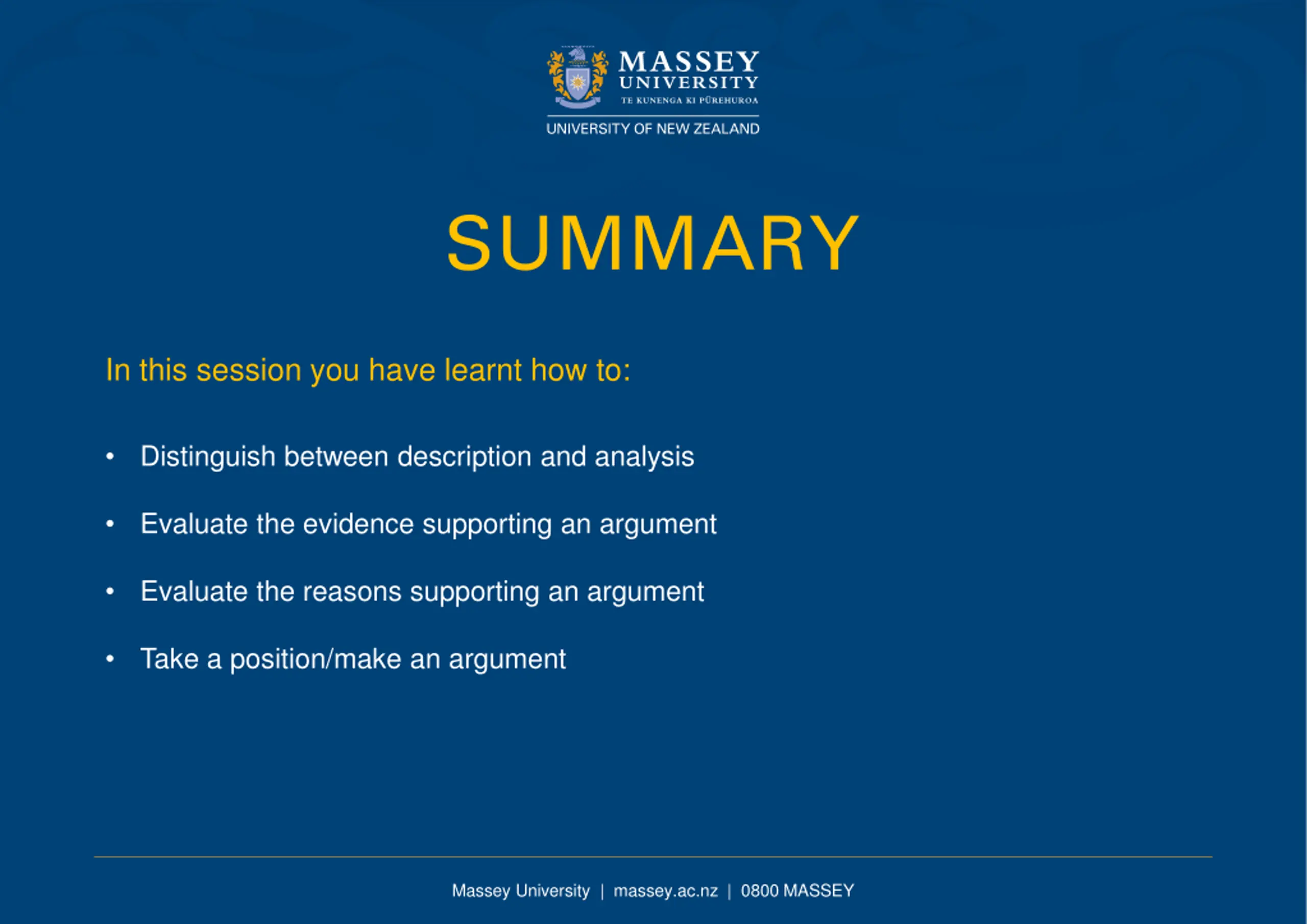 SUMMARY In this session you have learnt how to: Distinguish between description and analysis Evaluate the evidence supporting an argument Evaluate the reasons supporting an argument Take a position/make an argument Massey University | massey.ac.nz | 0800 MASSEY