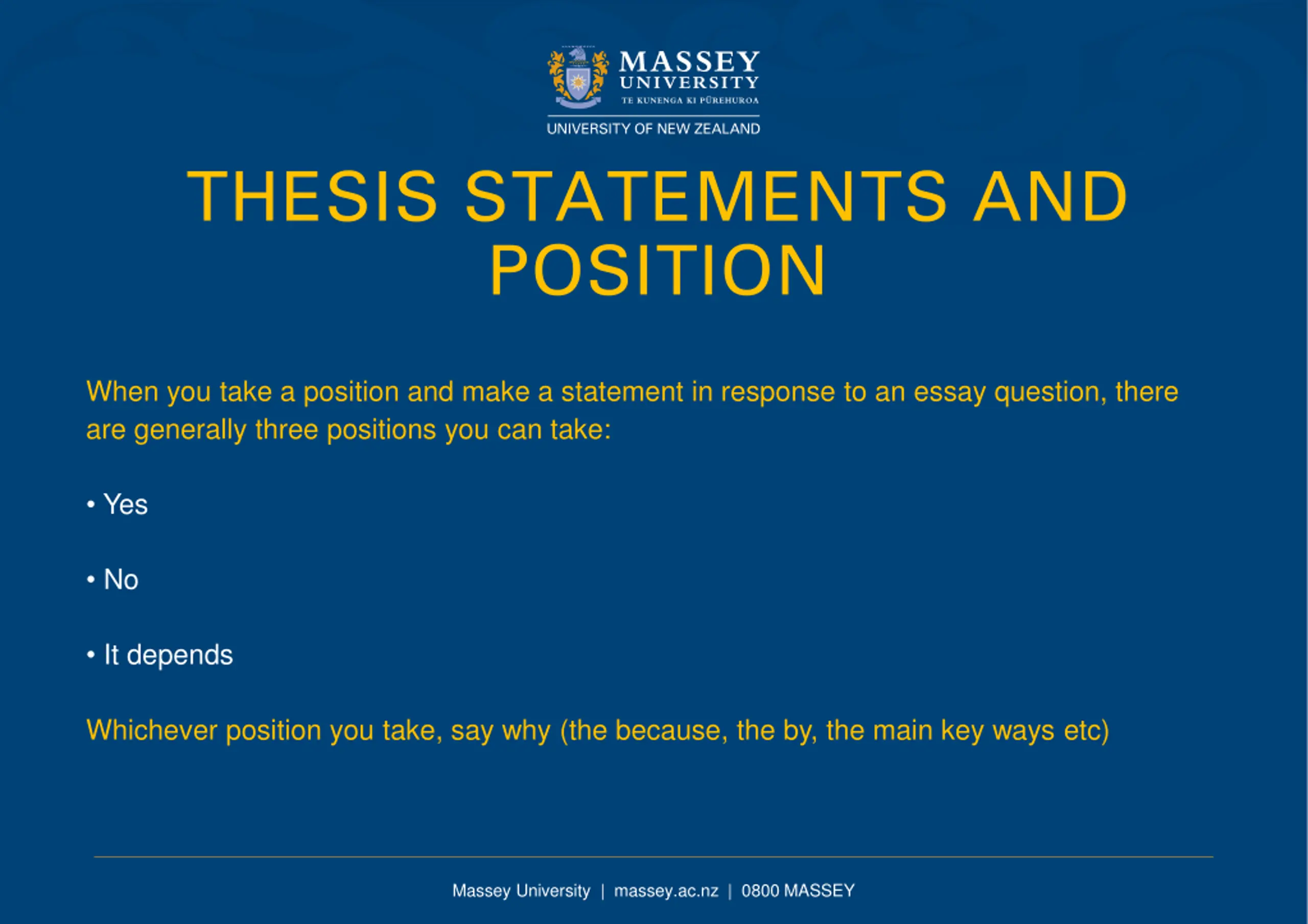 THESIS STATEMENTS AND POSITION When you take a position and make a statement in response to an essay question, there are generally three positions you can take: Yes No It depends Whichever position you take, say why (the because, the by, the main key ways etc) Massey University | massey.ac.nz | 0800 MASSEY