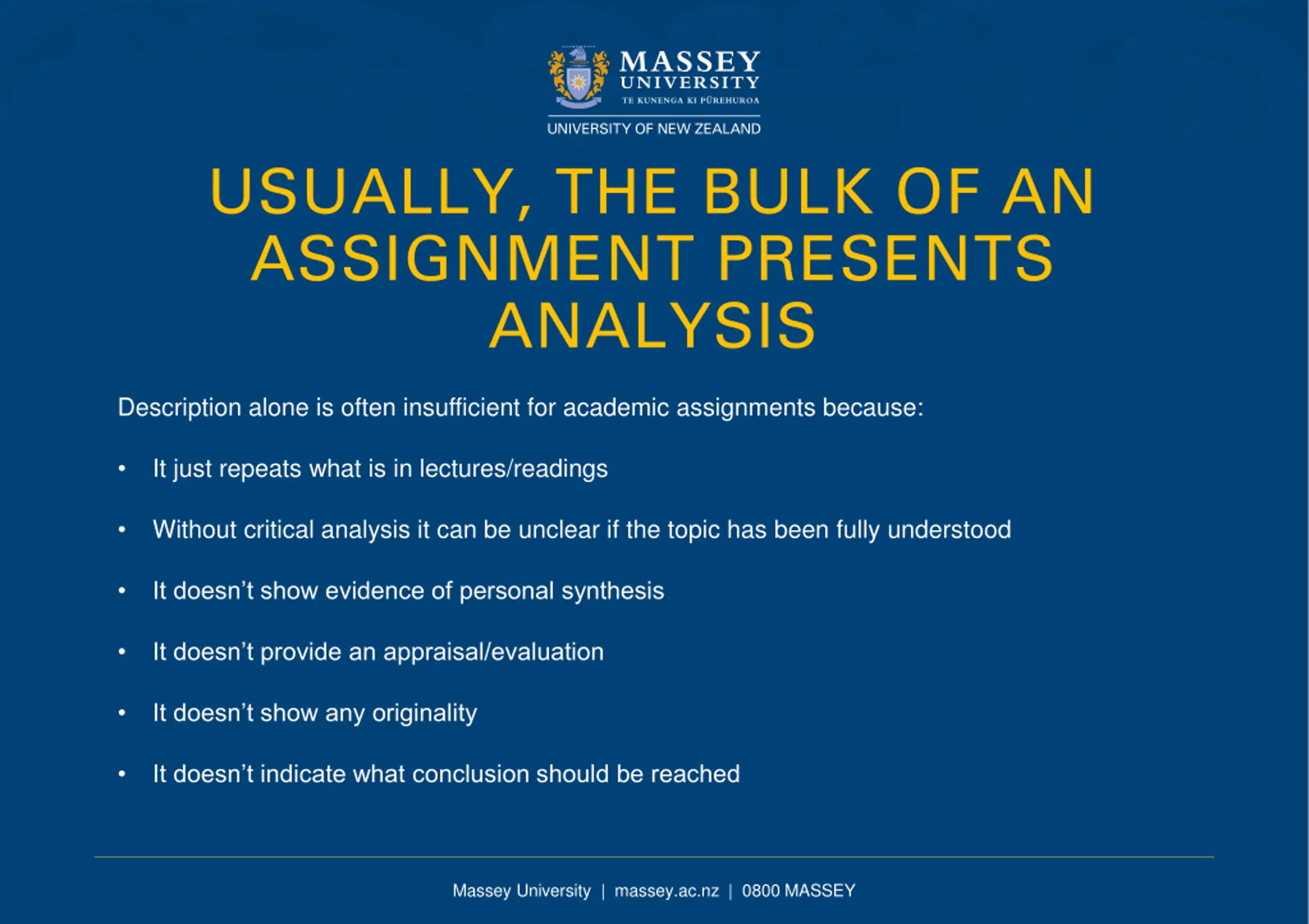 USUALLY, THE BULK OF AN ASSIGNMENT PRESENTS ANALYSIS Description alone is often insufficient for academic assignments because: It just repeats what is in lectures/readings Without critical analysis it can be unclear if the topic has been fully understood It doesn t show evidence of personal synthesis It doesn t provide an appraisal/evaluation It doesn t show any originality It doesn t indicate what conclusion should be reached Massey University | massey.ac.nz | 0800 MASSEY