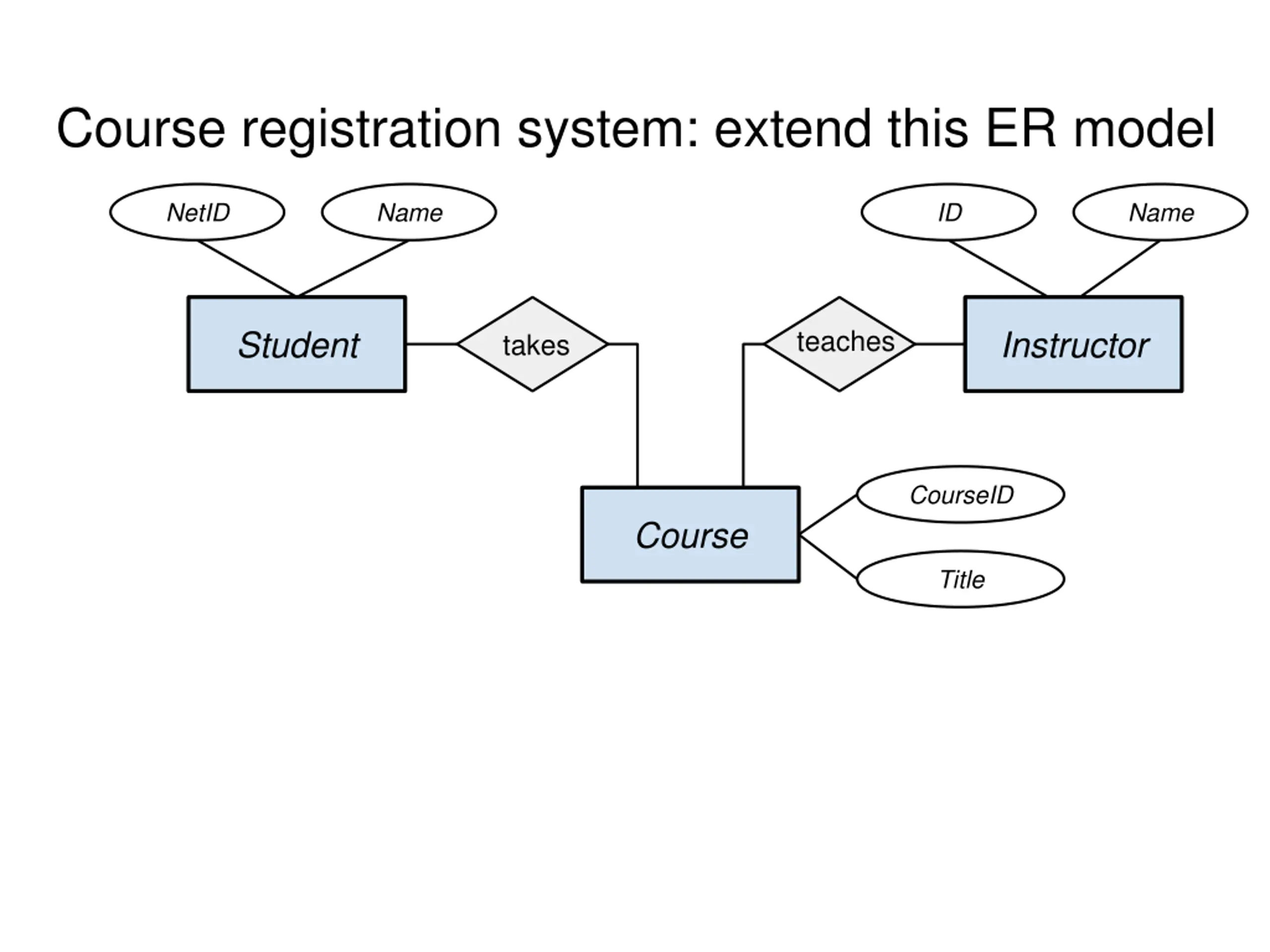 Course registration system: extend this ER model NetID Name ID Name Student Instructor teaches takes CourseID Course Title