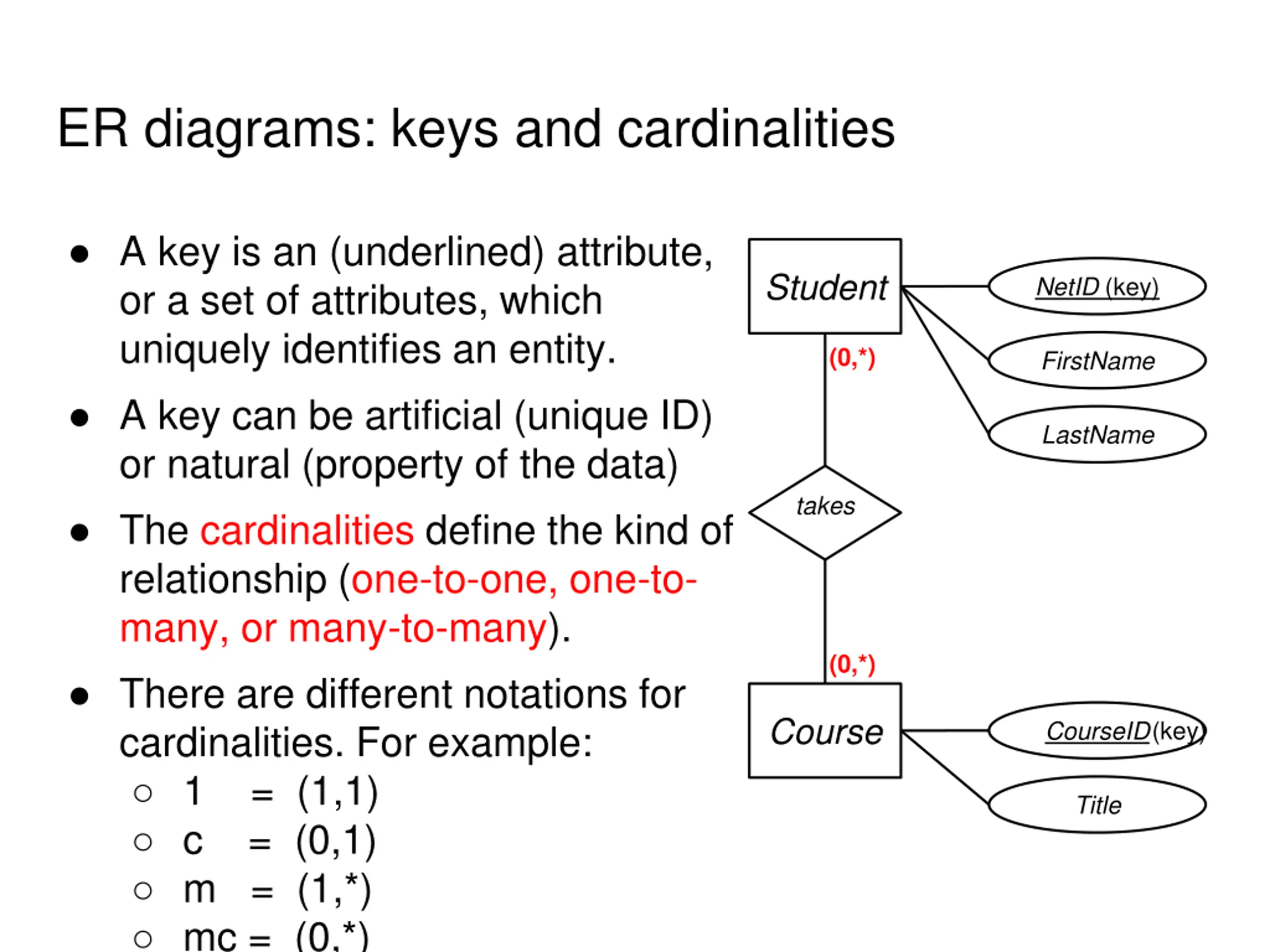 ER diagrams: keys and cardinalities A key is an (underlined) attribute, or a set of attributes, which uniquely identifies an entity. A key can be artificial (unique ID) or natural (property of the data) Student NetID (key) FirstName LastName takes Course (key) CourseID Title