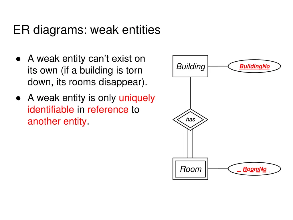 ER diagrams: weak entities A weak entity can t exist on its own (if a building is torn down, its rooms disappear). A weak entity is only uniquely identifiable in reference to another entity. Building BuildingNo has Room RoomNo