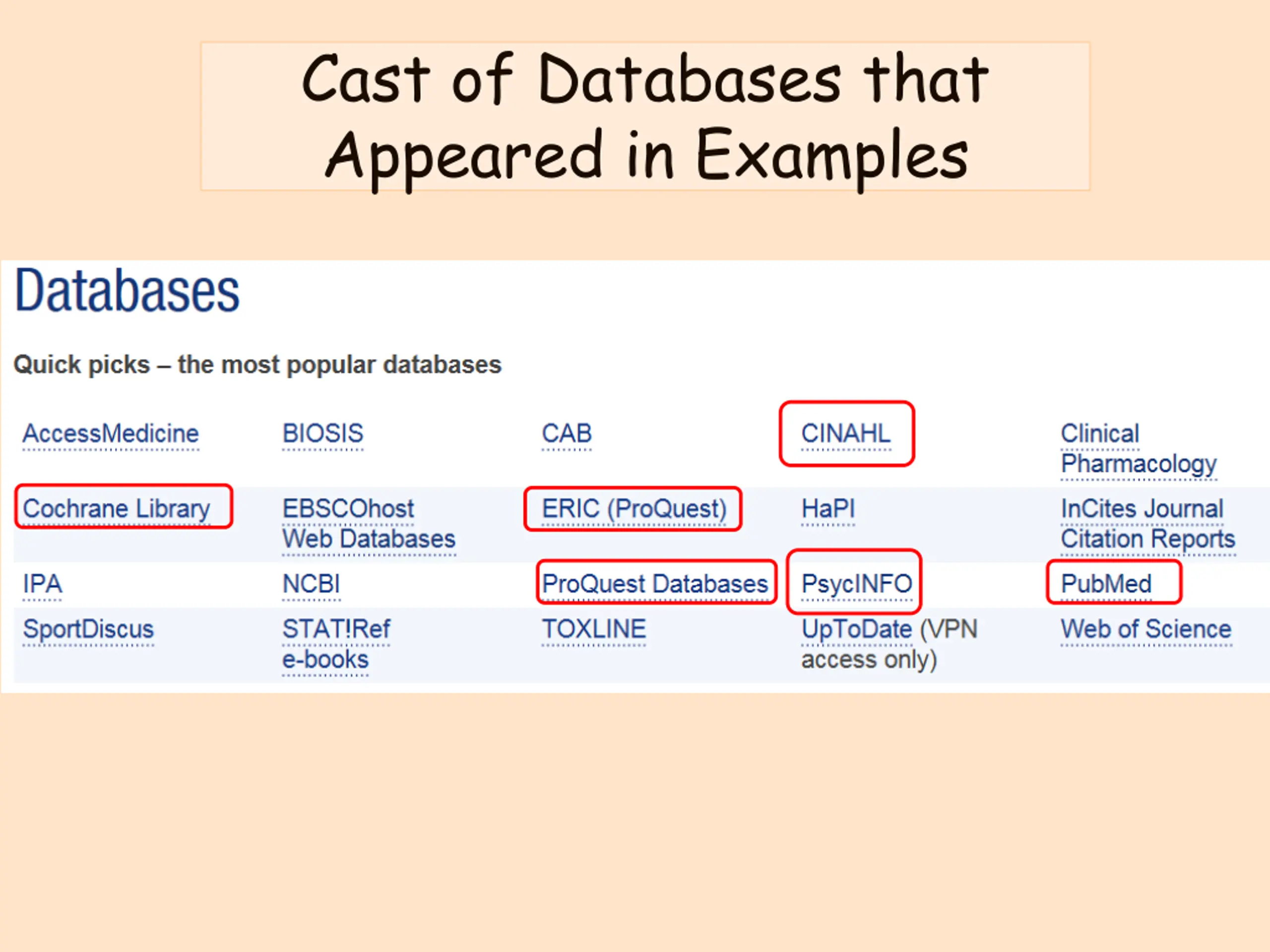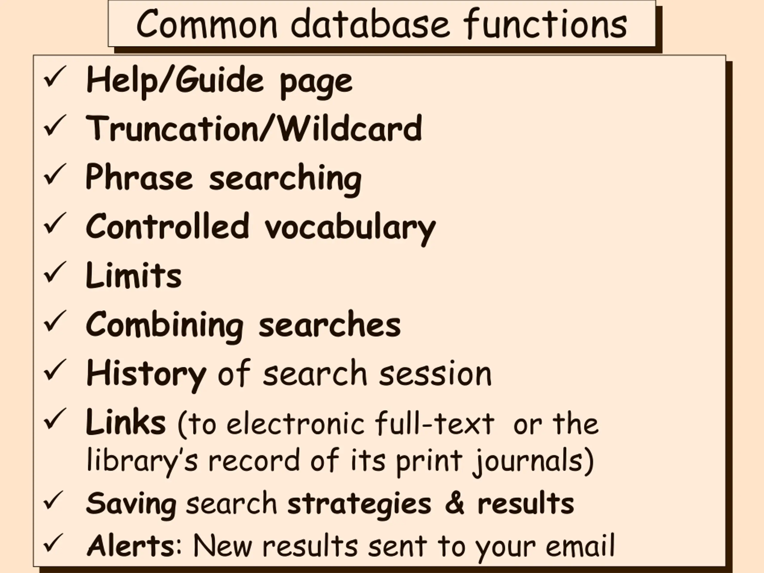 Common database functions Help/Guide page Truncation/Wildcard Phrase searching Controlled vocabulary Limits Combining searches History of search session Links(to electronic full-text or the library s record of its print journals) Saving search strategies & results Alerts: New results sent to your email